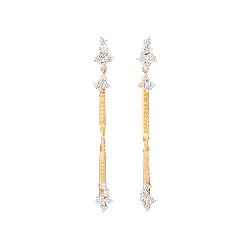 Серьги Marco Bicego Marrakech OG420 B YW M5 представляют собой изящную интерпретацию коллекции Marrakech, где декоративные мотивы сочетаются с итальянским ювелирным мастерством. Подвесная форма из 18K жёлтого золота выполнена в виде мягко скрученных нитей, создающих движение и текстуру — фирменный приём коллекции.