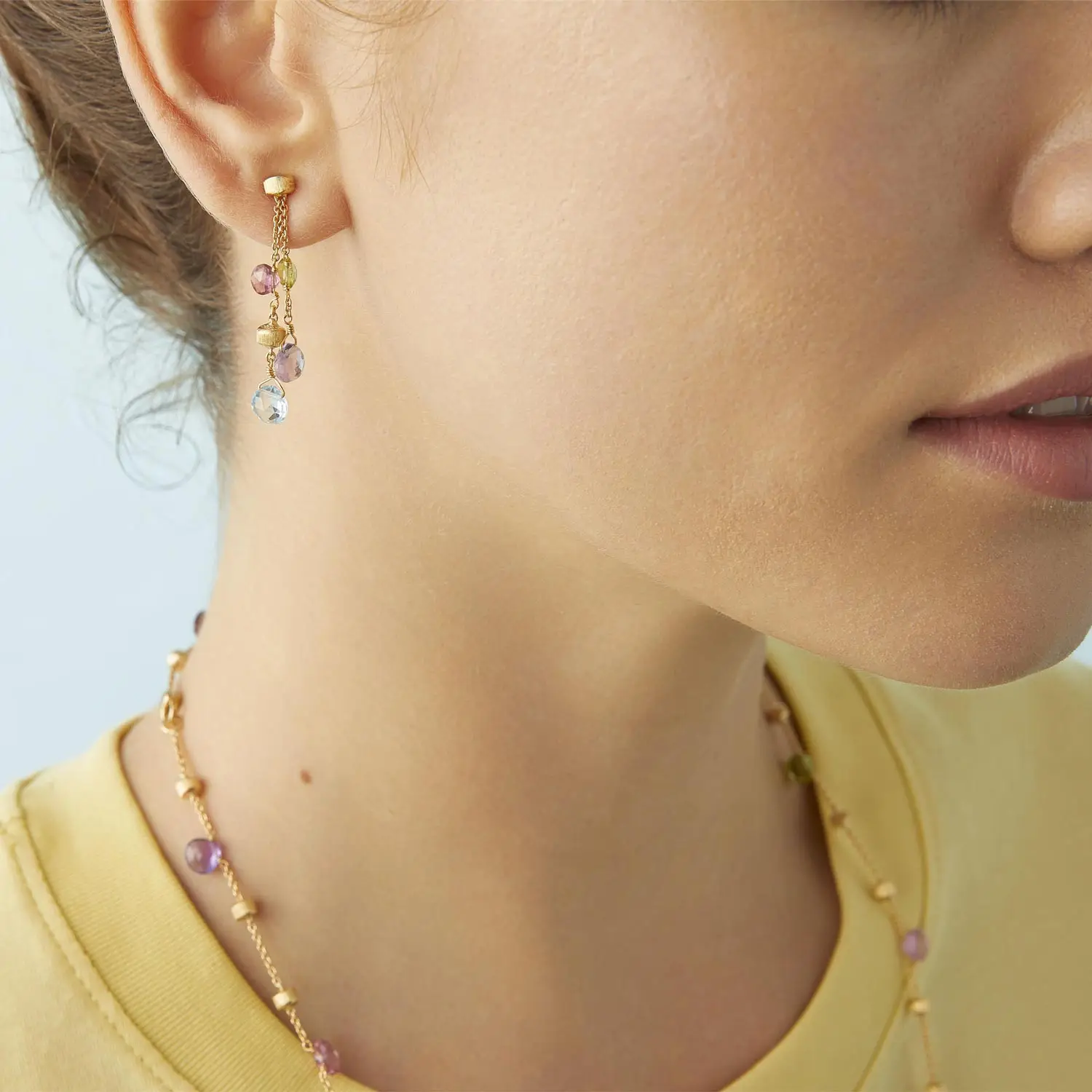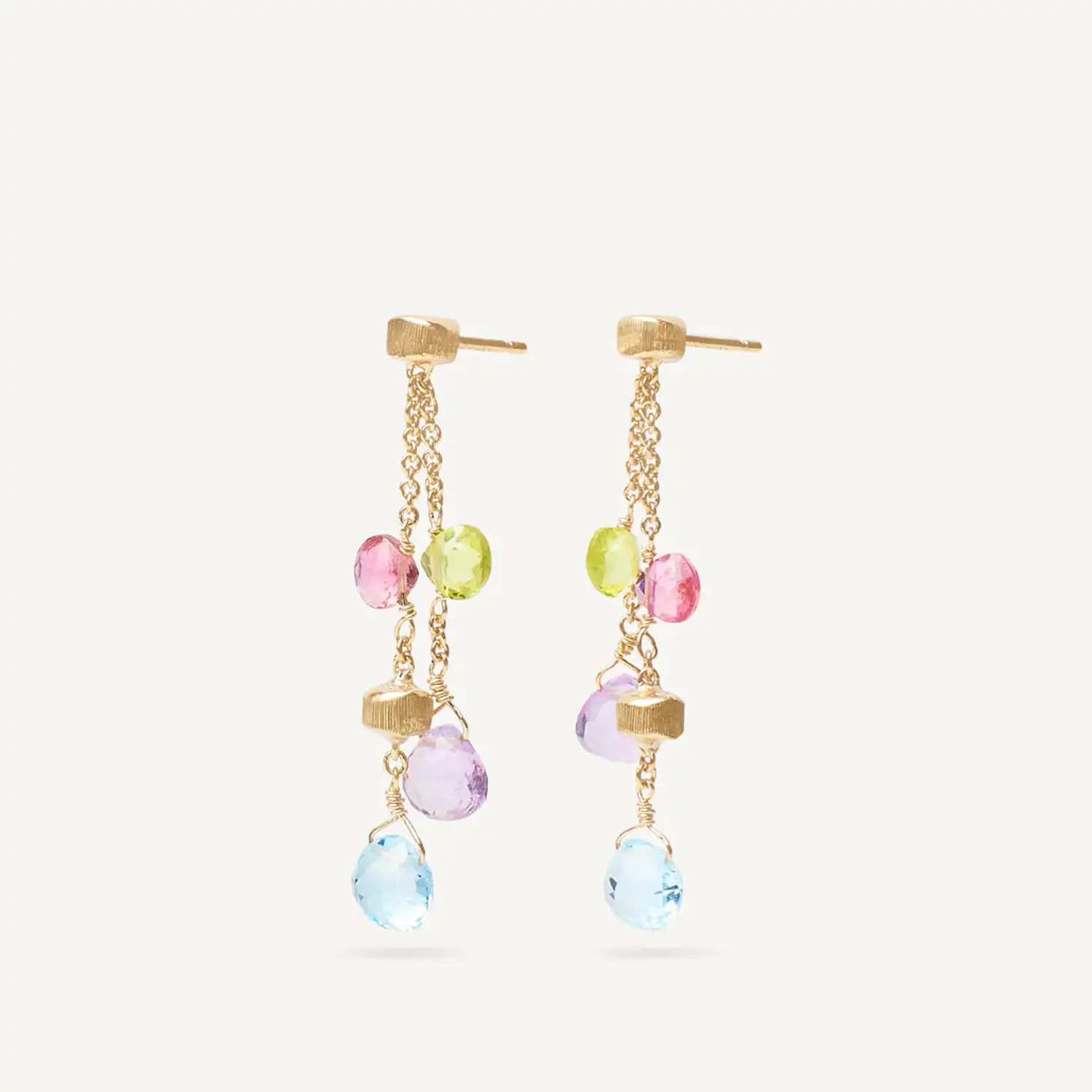 Роскошные золотые серьги Marco Bicego Paradise OB914 MIX01 Y 02 изготовлены из 18-каратного жёлтого золота (750/1000) и входят в культовую коллекцию Paradise, вдохновлённую яркими цветами природных драгоценных камней и светом средиземноморского пейзажа. Дизайн сочетает изящные золотые нити и разноцветные камни, создавая элегантную и лёгкую композицию.