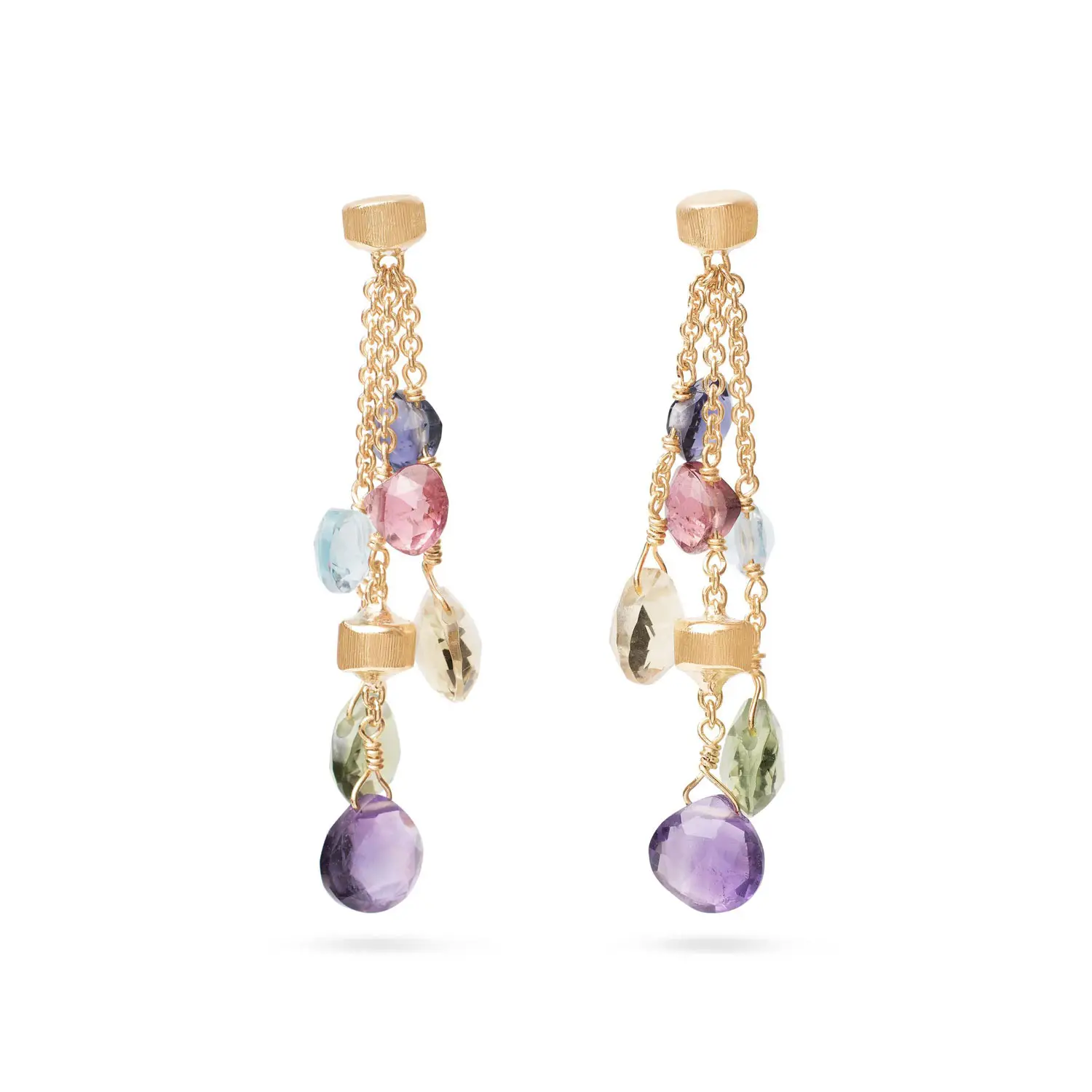 Роскошные золотые серьги Marco Bicego Paradise OB915 MIX01 Y 02 изготовлены из 18-каратного жёлтого золота (750/1000) и входят в культовую коллекцию Paradise, вдохновлённую яркими цветами природных драгоценных камней и светом средиземноморского пейзажа. Дизайн сочетает изящные золотые элементы и разноцветные камни, создавая элегантную и одновременно лёгкую композицию.