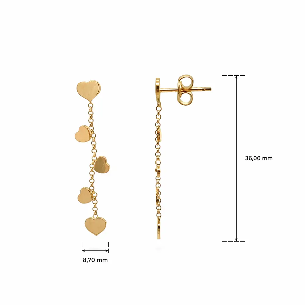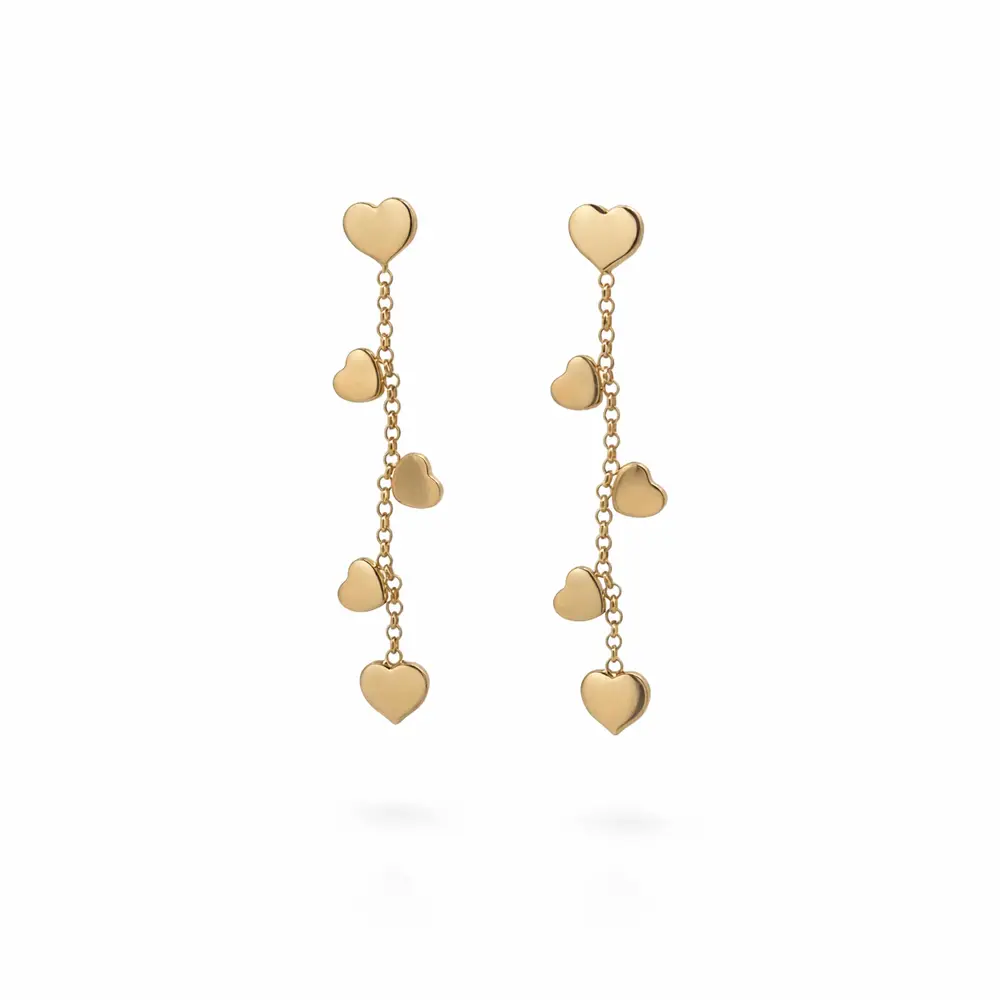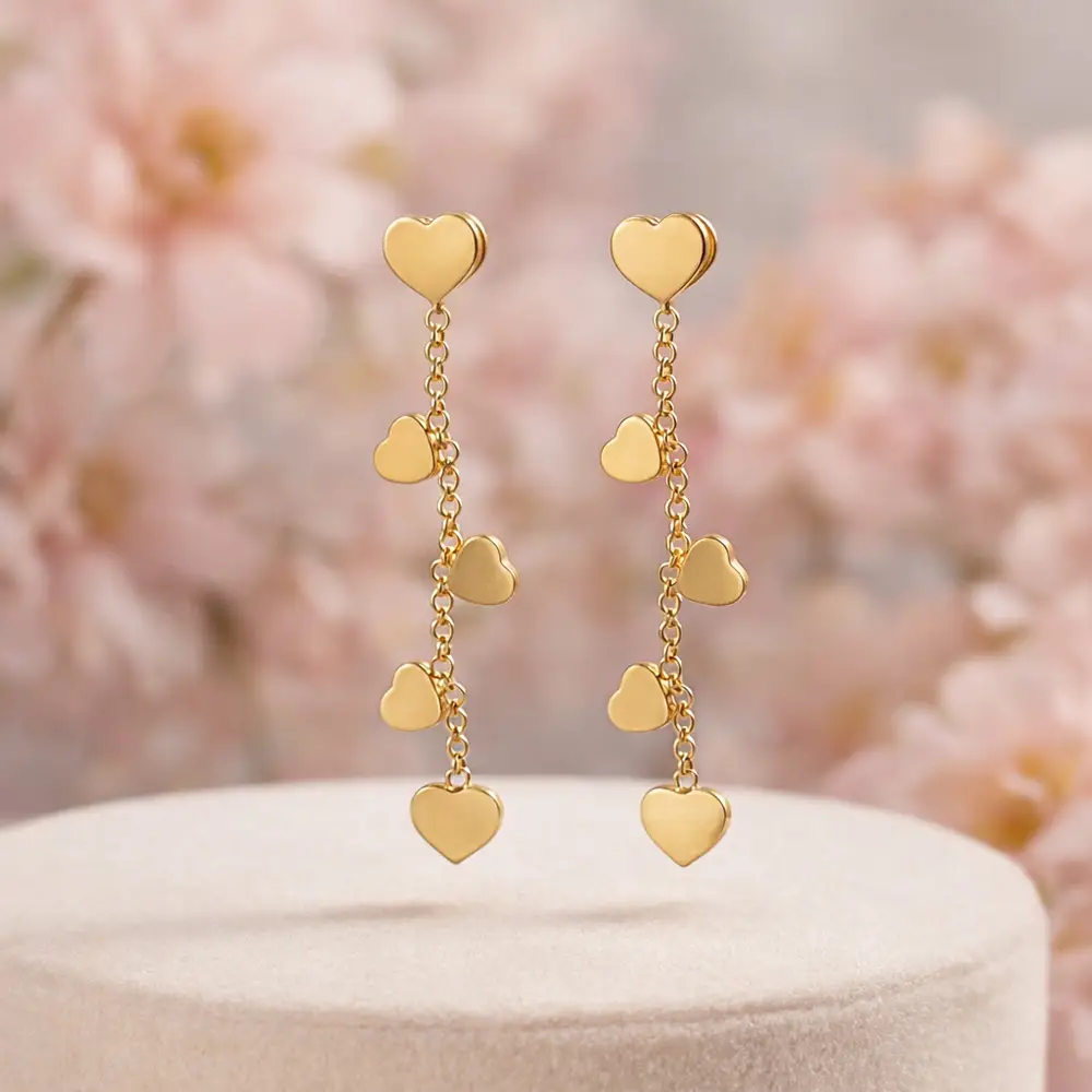 Золотые серьги-подвески с сердечками привлекают нежным и романтичным дизайном, который выглядит лёгким и элегантным. Миниатюрные сердечки на тонкой цепочке красиво движутся при каждом шаге, создавая изящный эффект и подчёркивая линию лица.
