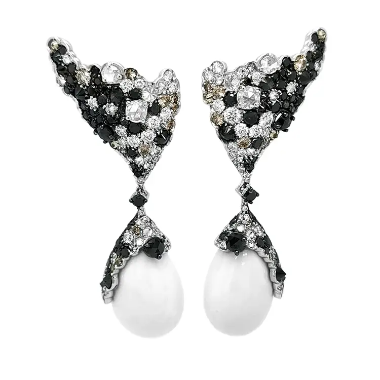 В центре — два природных белых агата в кабошонной огранке, дополненные чёрными бриллиантами общим весом 4,03 ct (102 камня) и белыми бриллиантами весом 2,61 ct (80 камней). Композицию завершает акцент из коричневых бриллиантов весом 0,99 ct (28 камней), добавляющий мягкость и глубину. Все камни — природного происхождения, идеально огранены и гармонично сбалансированы.