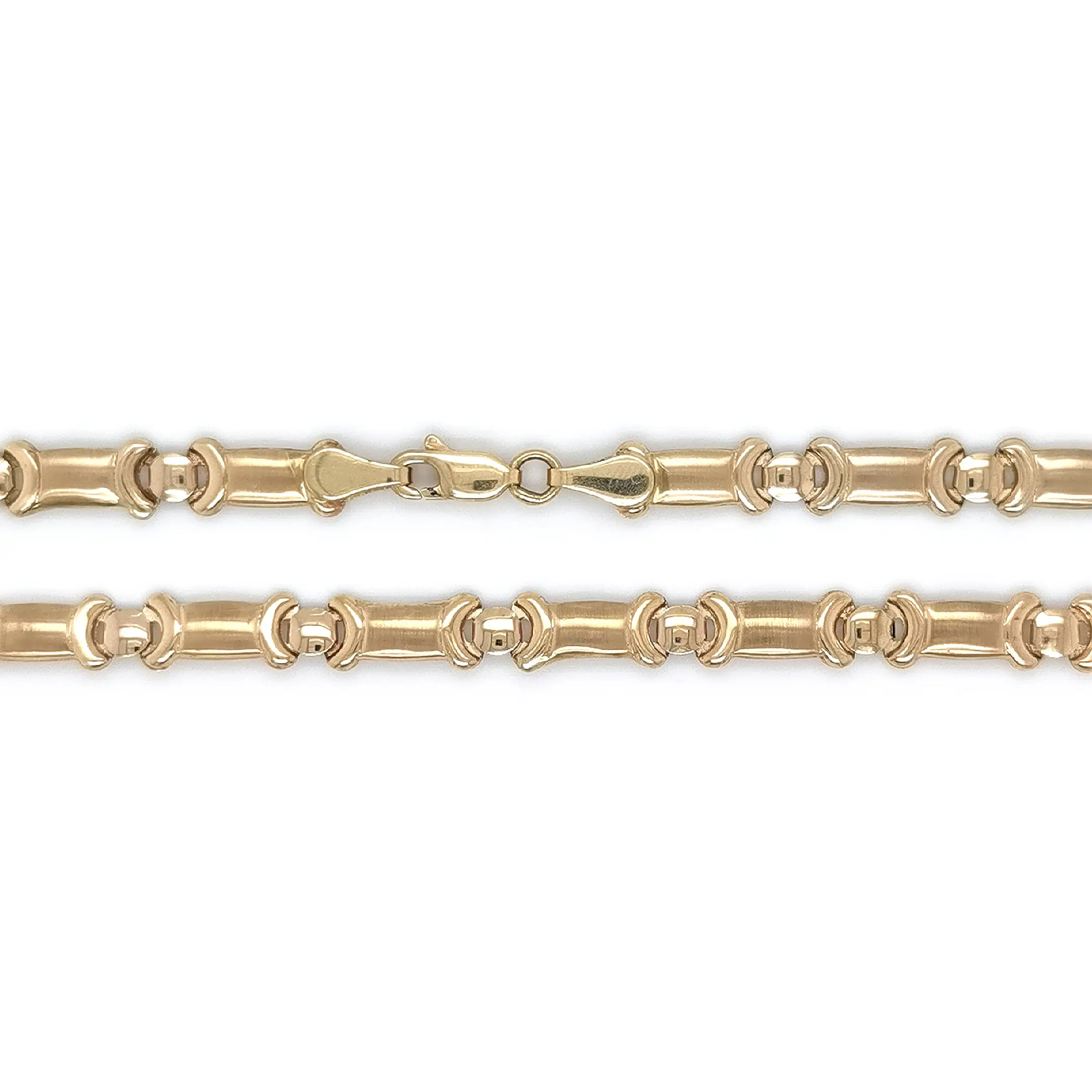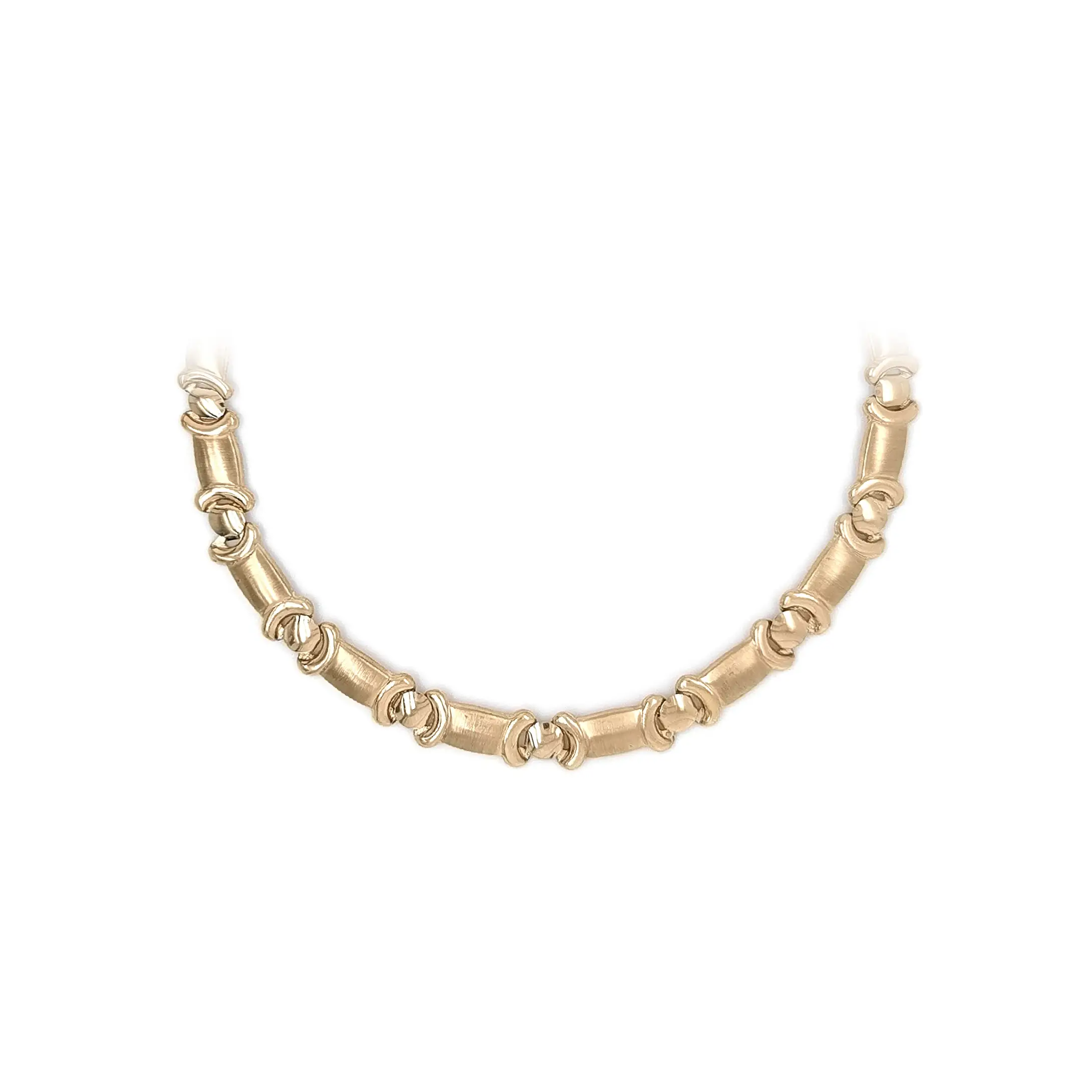 Золотое цепочное колье представляет современную интерпретацию классической цепочки с сочетанием глянцевой и матовой отделки. Сатинированные цилиндрические звенья контрастируют с полированными соединительными элементами, создавая выразительную глубину и утончённый внешний вид.