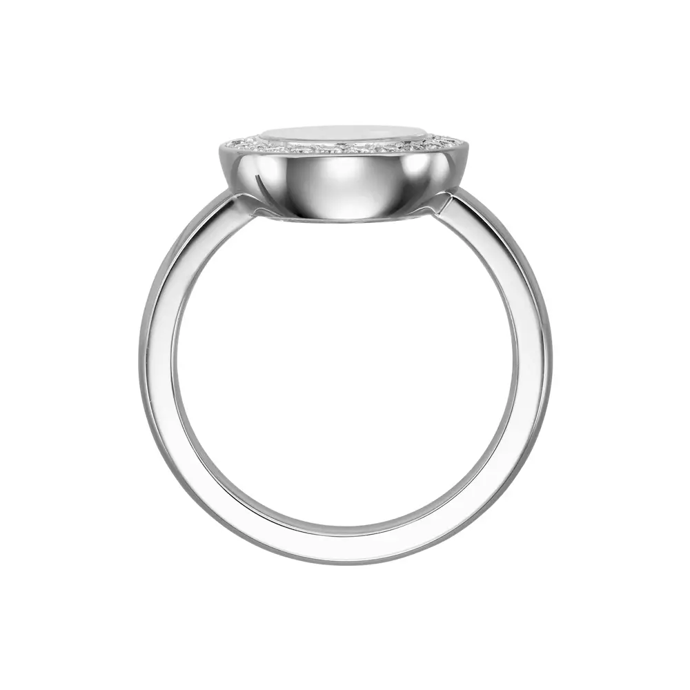 Кольцо Chopard Happy Diamonds Icons 82A018-1211, выполненное из белого золота 18 карат, воплощает гармонию элегантности и игривости. В центре украшения между двумя сапфировыми стёклами свободно движутся фирменные «танцующие бриллианты», символизирующие радость, свободу и свет, играющий в каждом движении.