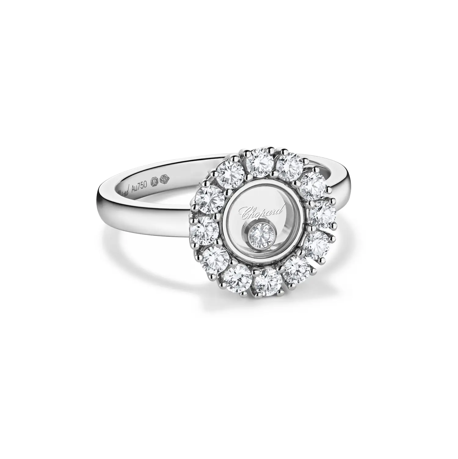 Это выразительное кольцо украшено 13 природными бриллиантами круглой огранки общим весом 0,60 карата, каждый из которых обладает чистотой IF и цветом F–G. Их ослепительное сияние прекрасно улавливает свет и подчёркивает безупречное мастерство исполнения. Смелый стиль отражает радость Happy Diamonds — камень, свободно заключённый между двумя слоями сапфирового стекла, «танцует» при каждом движении, создавая уникальный визуальный эффект.