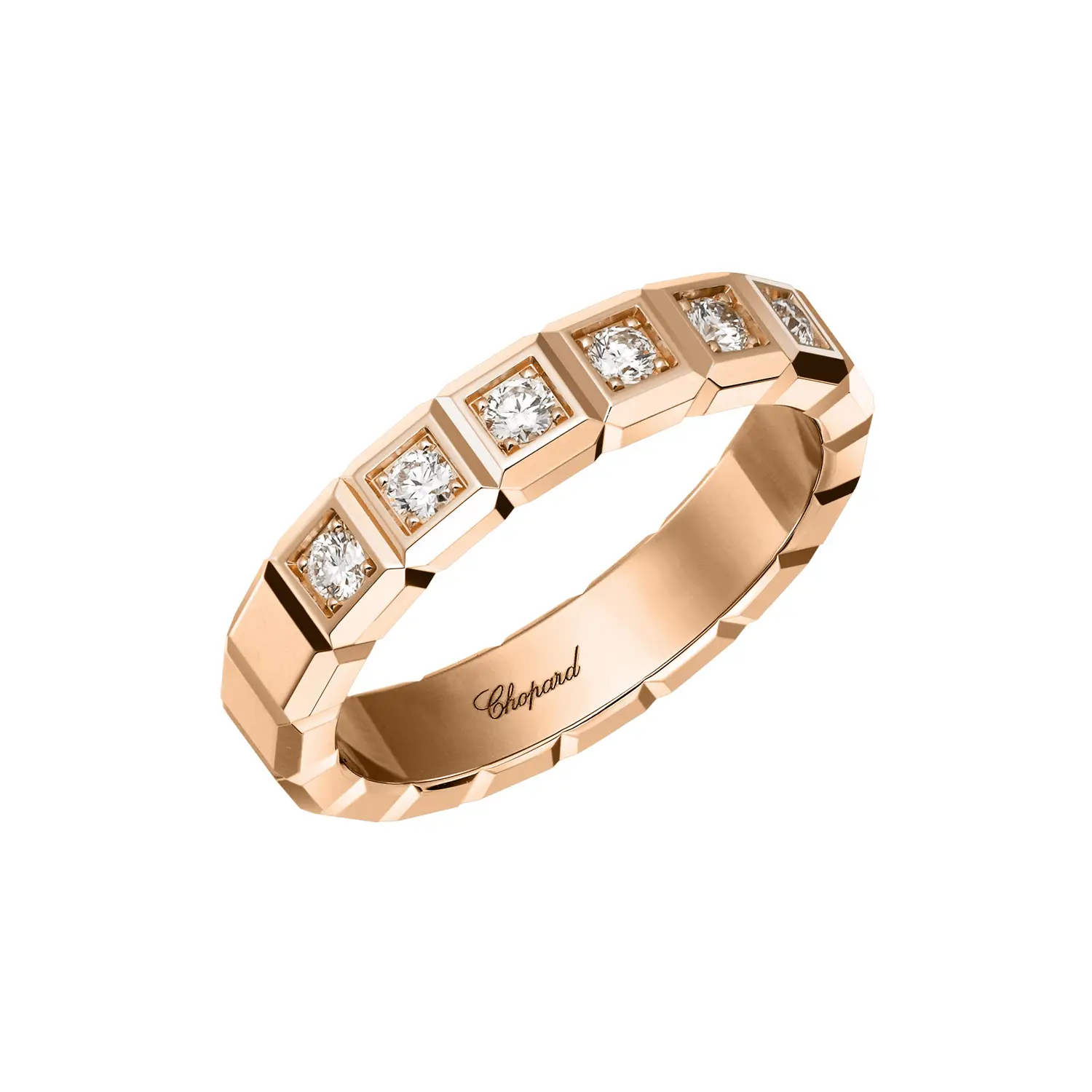 Кольцо Chopard Ice Cube из 18-каратного этичного розового золота воплощает идеальный баланс между современным минимализмом и сияющей роскошью. Его дизайн, вдохновлённый формой куба, отличается геометрической точностью, а бриллианты общим весом около 0,38 карата придают украшению ослепительное сияние. Полированные грани розового золота ловят свет при каждом движении, создавая утончённый эффект «скульптуры из света».