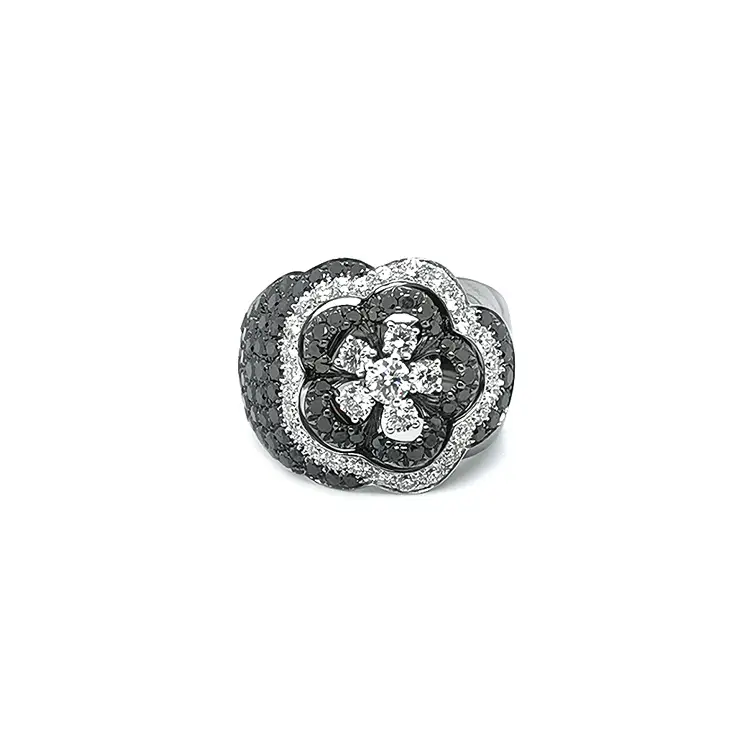 Сияние обеспечивают природные чёрные бриллианты 1,66 кт (75 шт.) круглой огранки, Ø 1,80 мм, которые обрамляют и формируют цветок. Контраст и блеск придаёт обод (halo) из природных белых бриллиантов 1,02 кт (31 шт.), круглая огранка (Ø 1,55–2,30 мм), чистота SI, цвет G. Точная закрепка и диалог тёмных и светлых камней создают роскошное, вне-временное и по-настоящему заметное кольцо.
