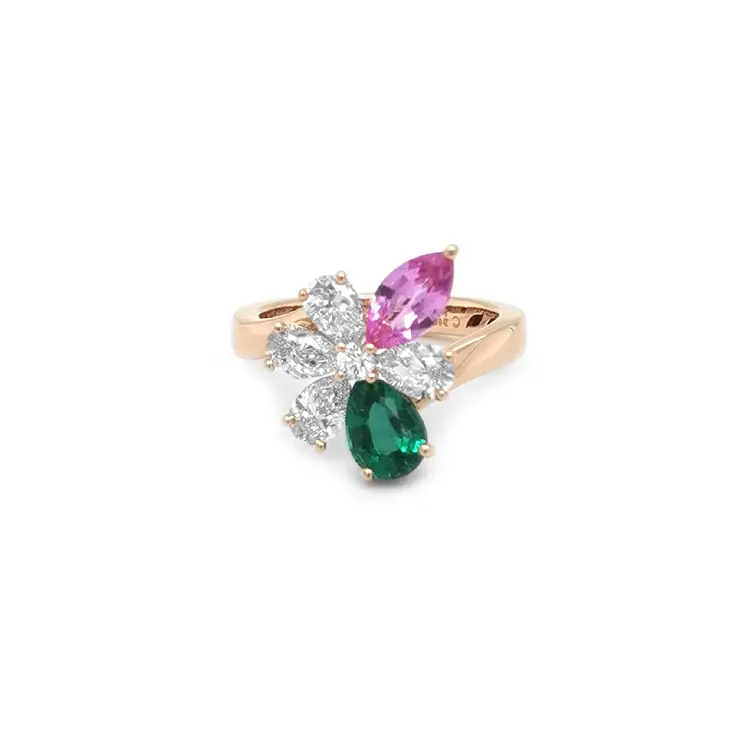 В центре — природный зелёный изумруд 0,82 кт, огранка «груша» (7,00 × 5,00 мм), дополненный природным розовым сапфиром 0,68 кт, огранка «маркиз» (8,40 × 4,40 мм). Их контраст подчёркивает ансамбль бриллиантов — четыре природных белых бриллианта огранки «груша» общей массой 1,19 кт (4,65 × 3,50 мм), чистота VS, цвет F, а также один круглый бриллиант 0,06 кт (Ø 2,00 мм), чистота VS2, цвет F. В итоге — украшение, выделяющееся цветовой гаммой, оригинальностью и роскошным характером.
