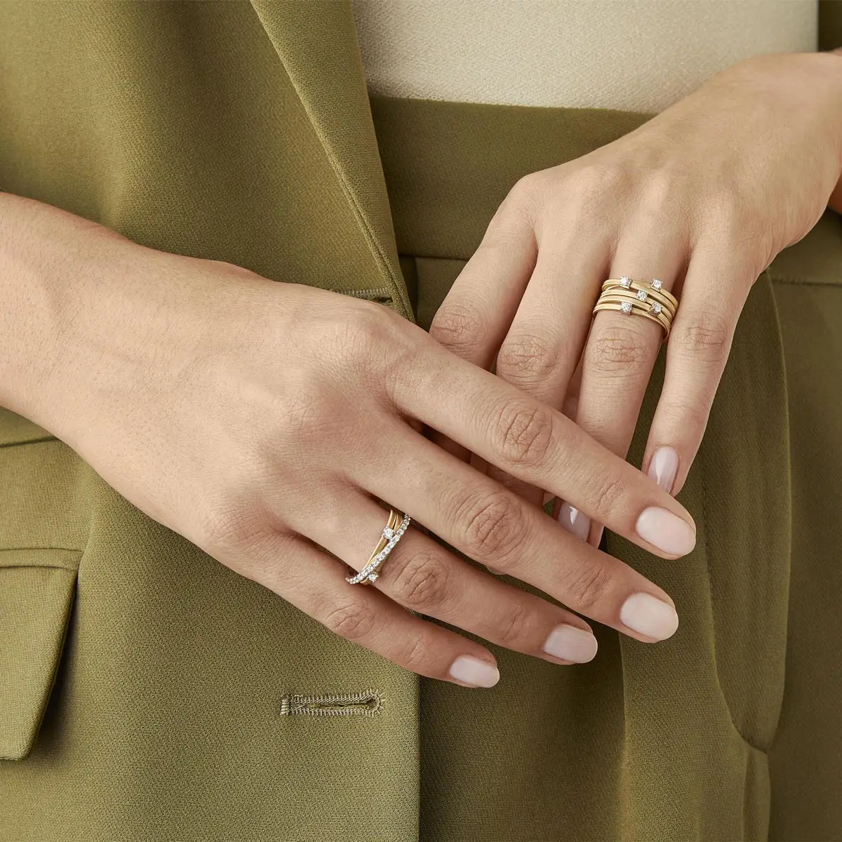 Каждое изделие изготавливается вручную: золотые полосы аккуратно формируются и перекрещиваются, создавая эффект естественного движения и мягкости. Goa доступна в жёлтом, белом и розовом золоте, часто дополненном сверкающими бриллиантами, подчеркивающими архитектурную чистоту дизайна.
