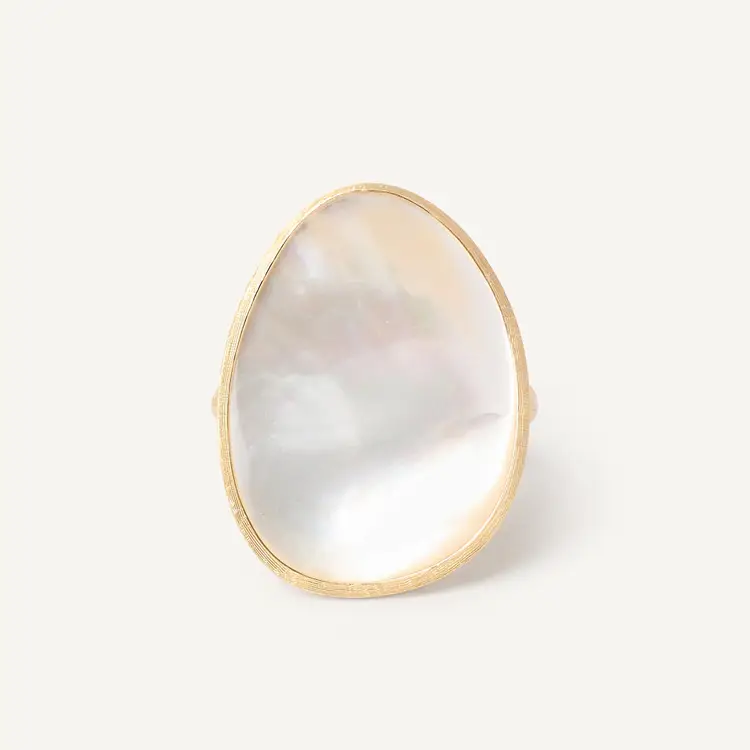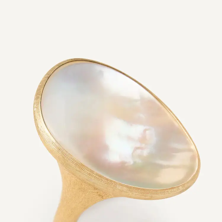 В центре украшения расположен природный перламутр (mother-of-pearl / nacre) размером 25,60 × 18,80 мм. Один камень придаёт кольцу мягкую цветовую гамму и природную красоту.