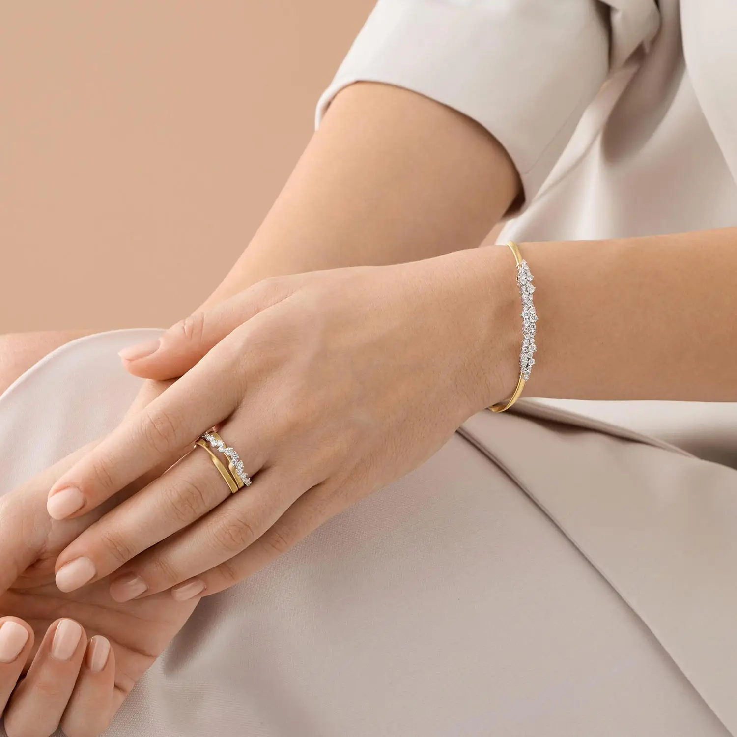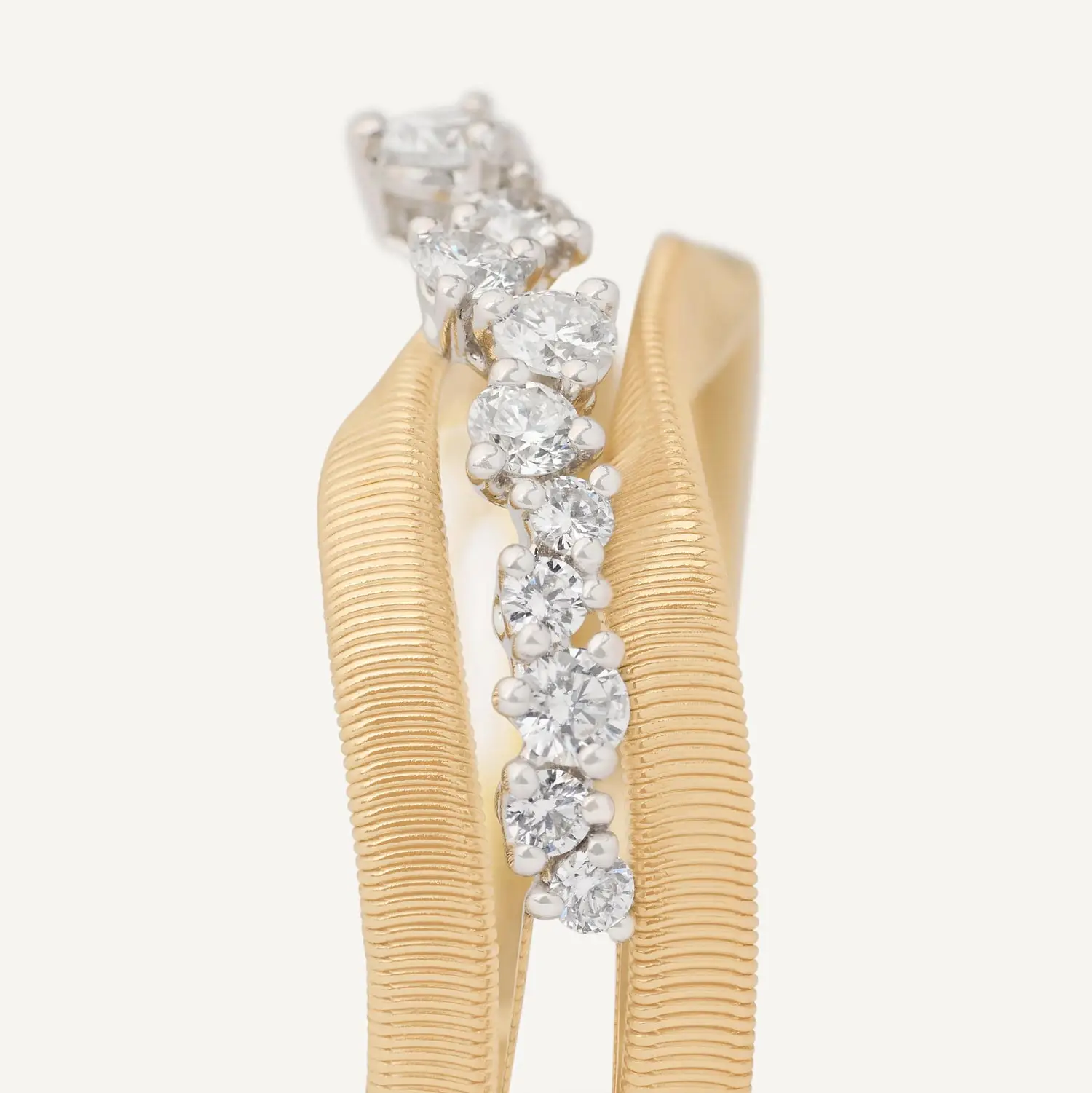 Кольцо Marco Bicego из жёлтого золота 18 карат с тремя переплетёнными линиями и рядом бриллиантов является воплощением итальянского ювелирного мастерства и внимания к деталям. Органично сформированные золотые линии плавно переплетаются, создавая выразительный и динамичный эффект, характерный для бренда Marco Bicego. Изящная линия бриллиантов придаёт украшению утончённое сияние и элегантный контраст с тёплым оттенком золота.
