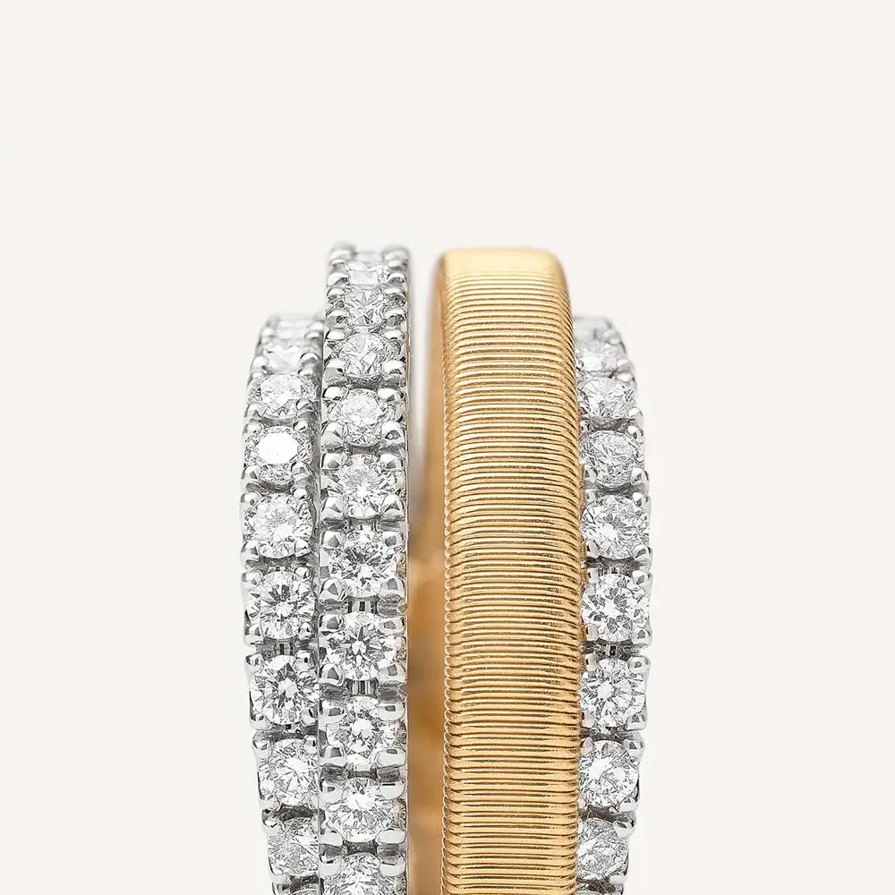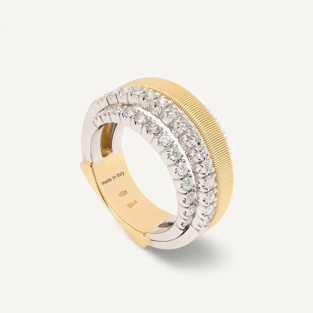 Кольцо Marco Bicego Masai AG363 B2 YW M5 сочетает смелый дизайн с утонченным роскошным стилем. Оно изготовлено из комбинированного золота 18 кт (750/1000) с глянцевой отделкой, что подчёркивает выразительные линии и контрасты.