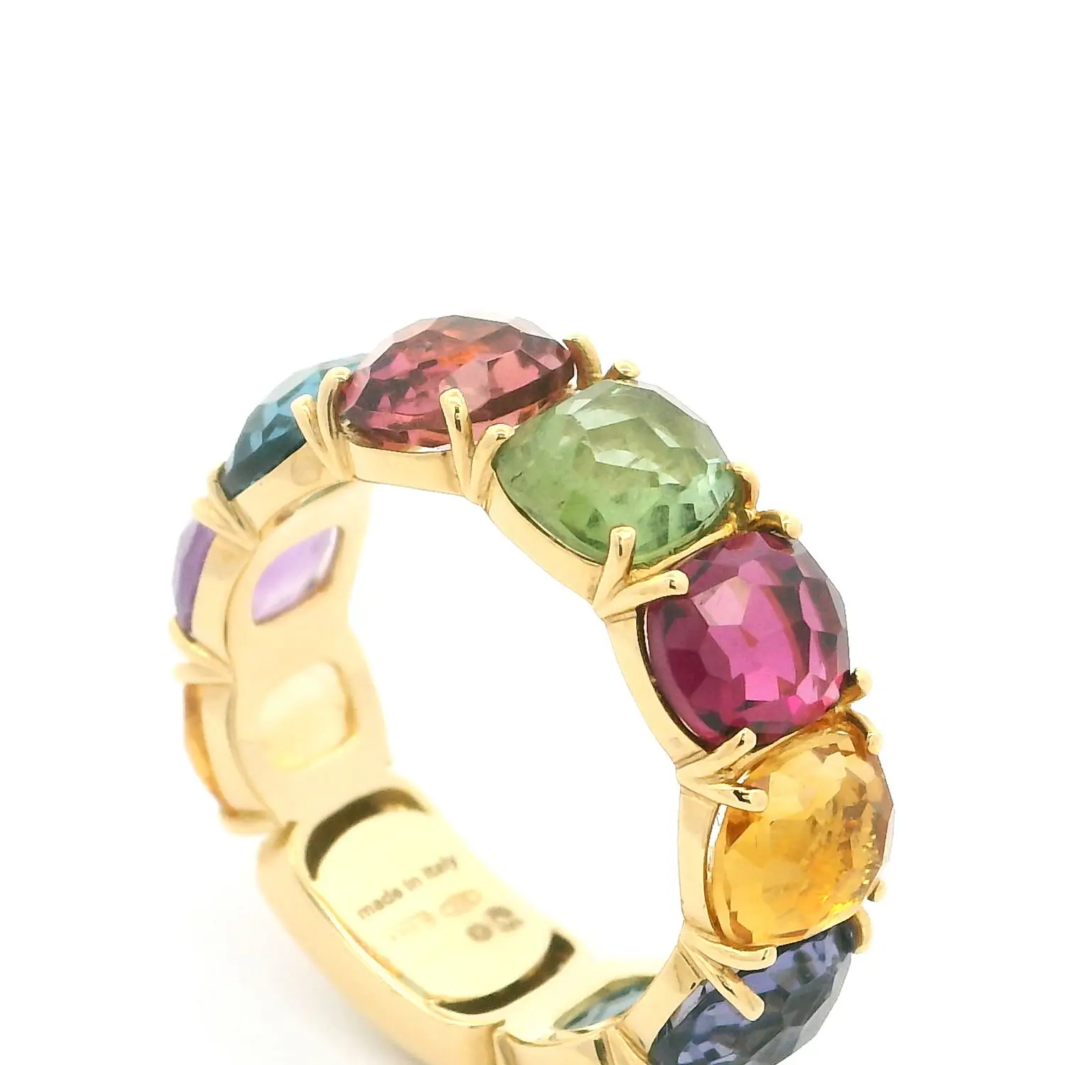 Кольцо из коллекции Marco Bicego Murano поражает тщательно подобранной палитрой цветных драгоценных камней, расположенных в гармоничном градиенте, вдохновлённом яркой атмосферой Венеции. Каждый камень закреплён вручную в оправе из 18К жёлтого золота и огранён таким образом, чтобы подчеркнуть его цвет, чистоту и природное сияние, создавая игривый и одновременно утончённый цветовой эффект — характерный для линии Murano.