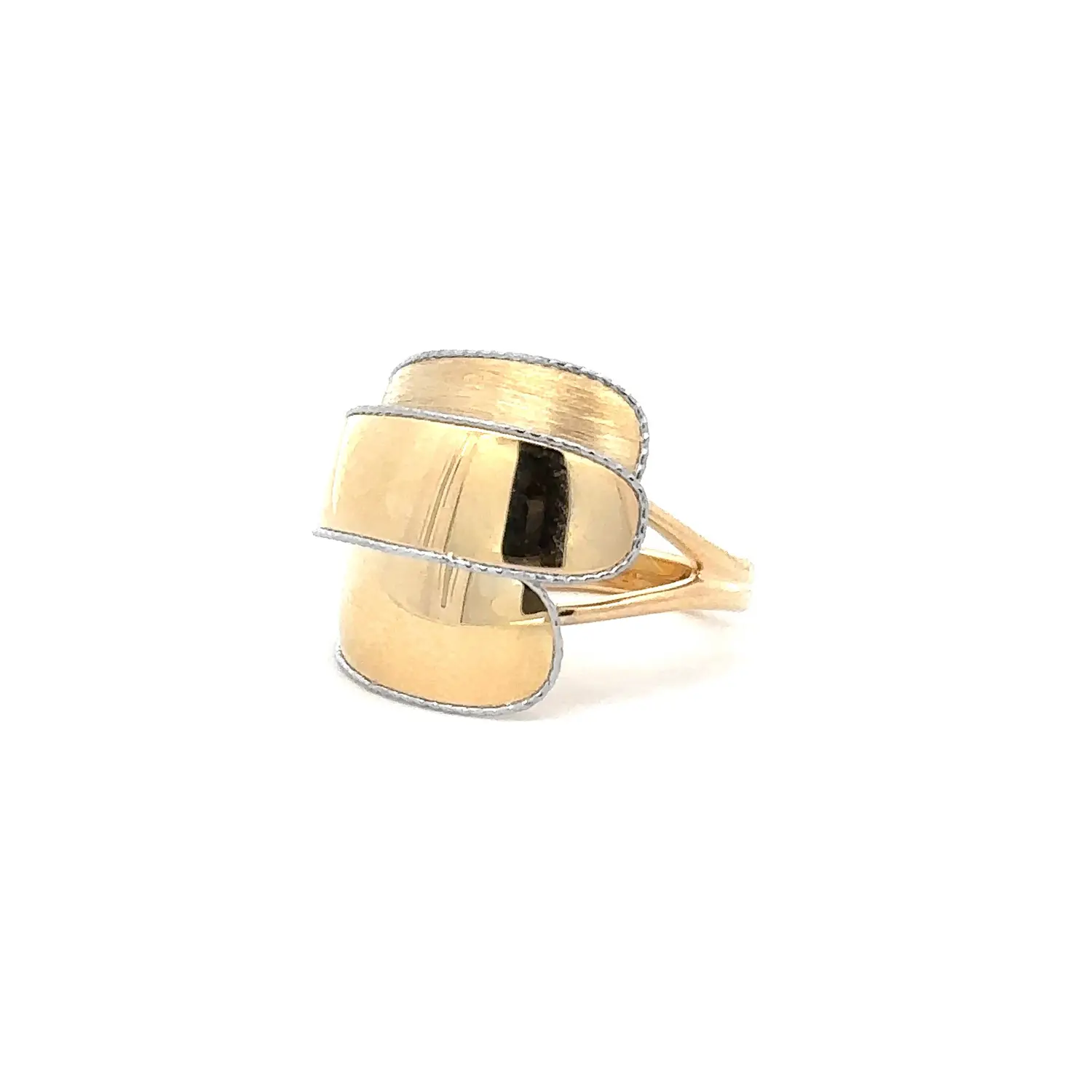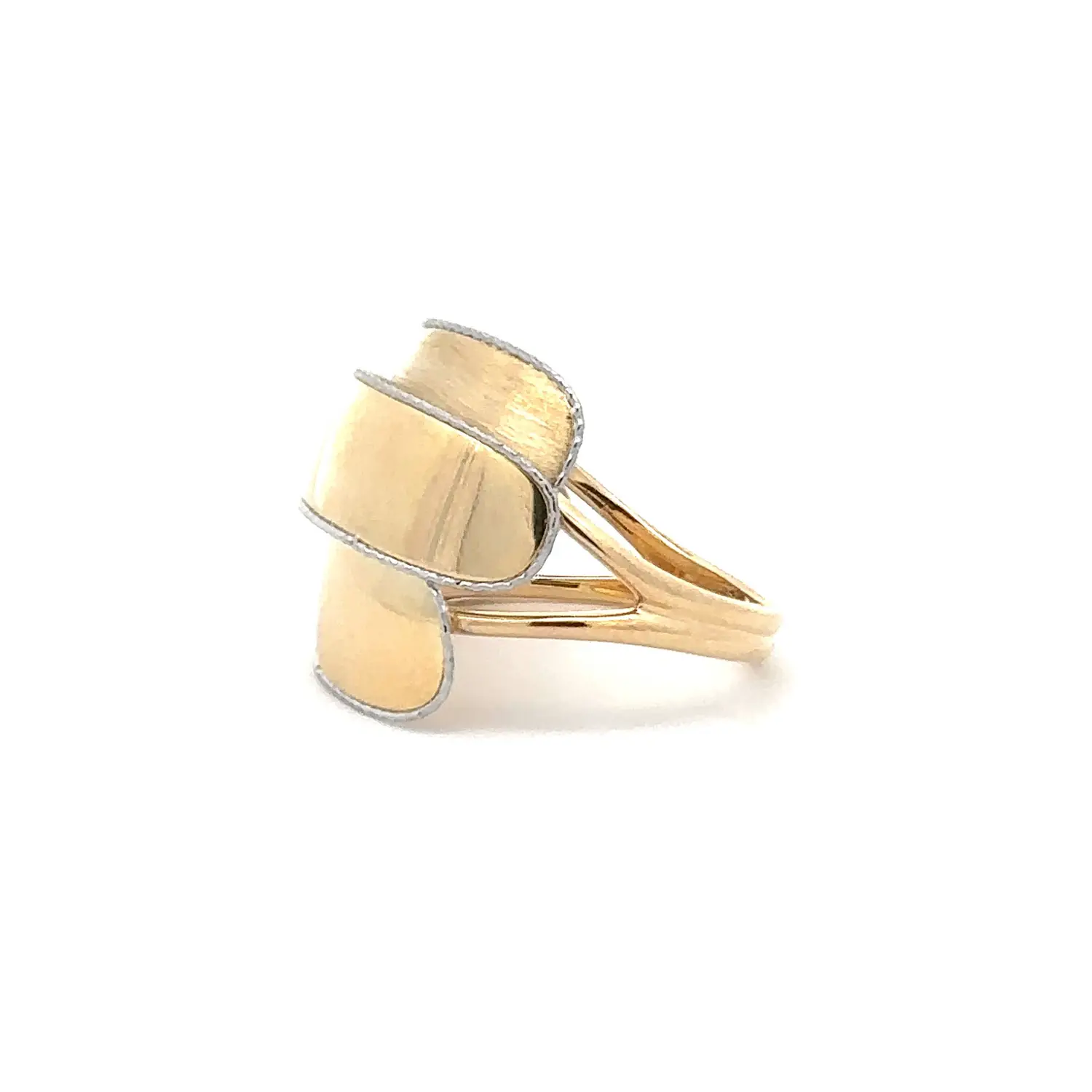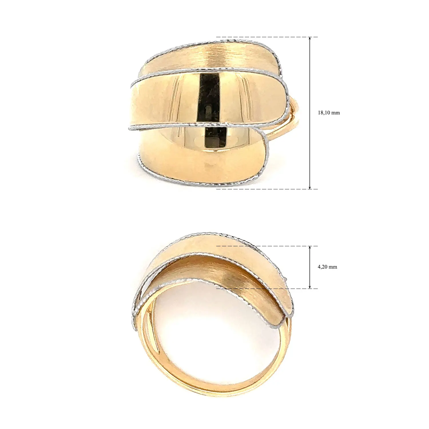 Это кольцо привлекает внимание своей пластичной формой с перекрывающимися линиями, выполненной из сочетания жёлтого и белого золота. Тонкий контраст поверхностей придаёт украшению современный и элегантный характер, одновременно необычный и гармоничный. Органичные изгибы создают выразительную динамику и добавляют дизайну художественность.