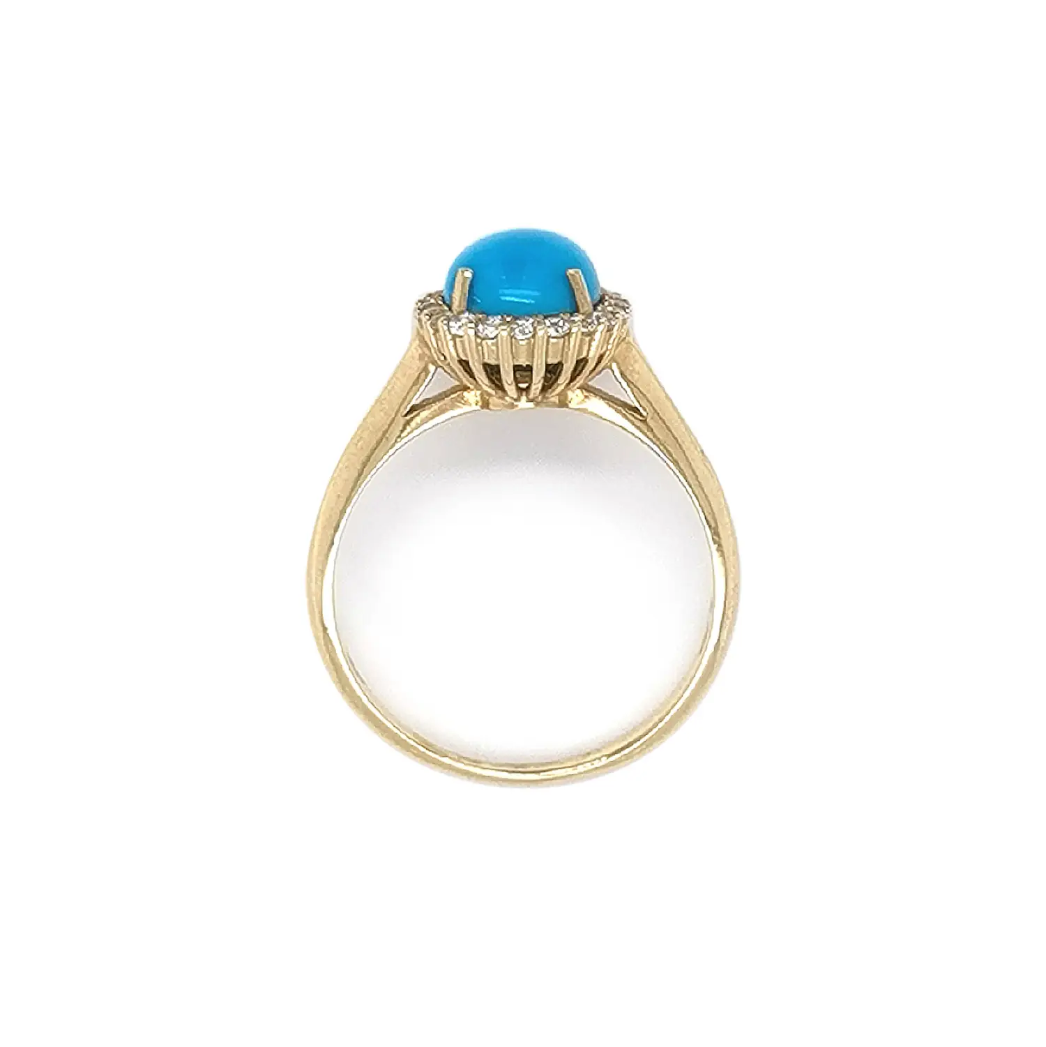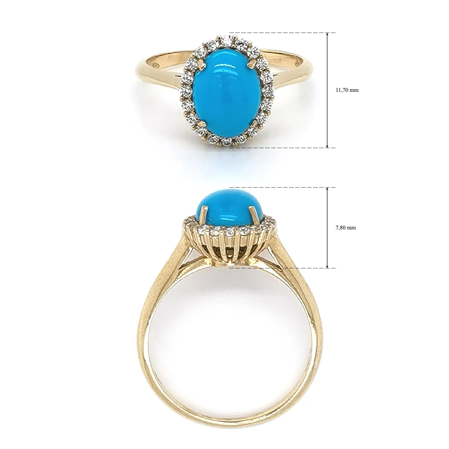 Это элегантное золотое кольцо украшено выразительным овальным бирюзовым камнем, помещённым в изящную оправу и окружённым сияющим кольцом циркония. Контраст яркой бирюзы и тёплого блеска золота создаёт утончённое и запоминающееся украшение.