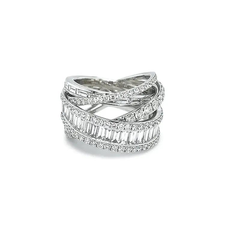 В композиции доминируют природные бриллианты 2,27 кт (30 шт.) огранки багет размером 3,20 × 2,10 мм, белые, чистота VS, цвет G. Их сияние усиливает паве из природных бриллиантов 1,69 кт (78 шт.) круглой/бриллиантовой огранки (Ø 1,35–2,20 мм), белые, чистота SI, цвет G. Точная закрепка подчёркивает контраст форм и максимальную игру света — результатом становится роскошное, вне-временное и по-настоящему заметное кольцо.