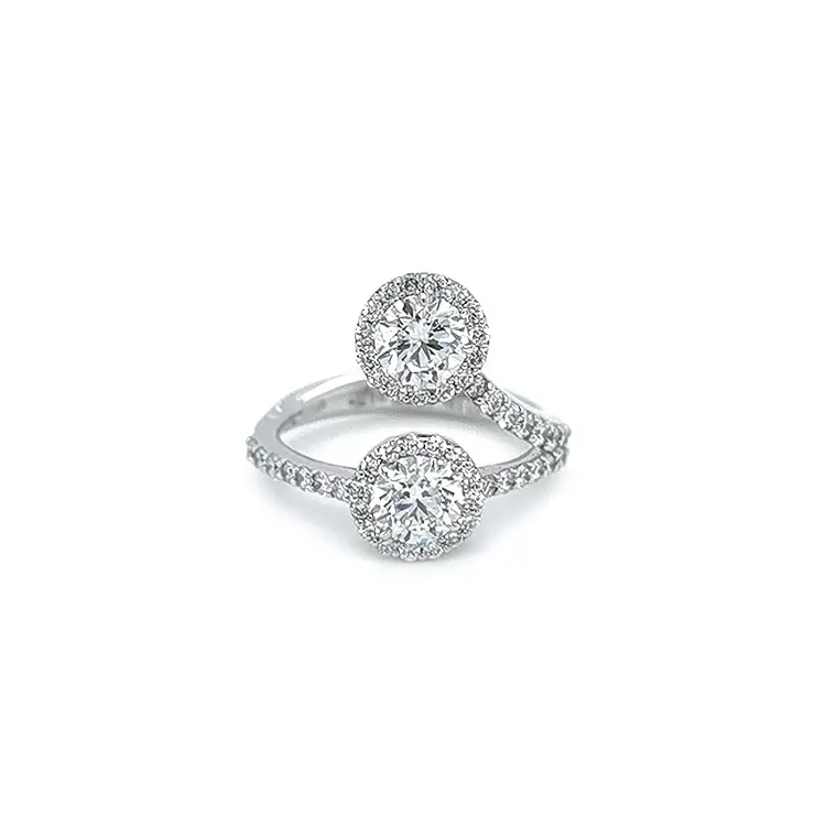 Золотое помолвочное кольцо с бриллиантами очаровывает чистой элегантностью стиля halo и симметрией двух центральных камней. Выполнено из белого золота 18 карат (750/1000) с полированной поверхностью; высота 5,90 мм подчеркивает сбалансированные пропорции. Вневременная композиция, благородная и торжественная — идеальна для особого момента.