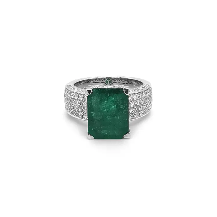 Это изысканное кольцо со смарагдом и бриллиантами от BENY Jewellery — воплощение роскоши, силы и элегантности. Изготовлено из белого золота 18 карат (750/1000) с зеркальной полировкой, поражает насыщенным зелёным цветом и сиянием. В центре композиции находится природный смарагд весом 4,40 карата, огранки Emerald (12,35 × 9,5 мм), символ гармонии и утончённости.