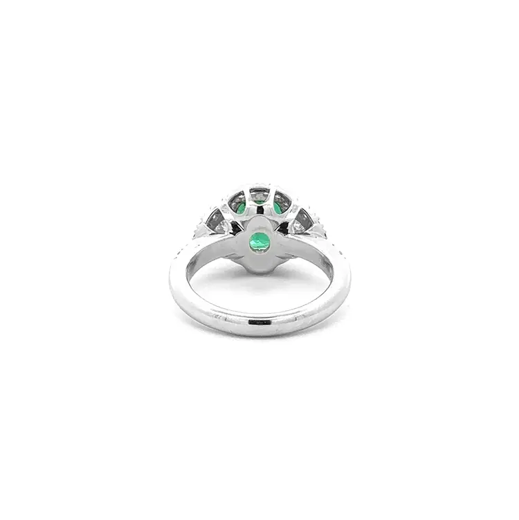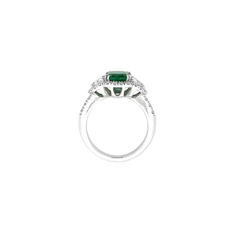По бокам главного камня расположены два триллиант-бриллианта (всего 0,47 к) и круглые бриллианты (всего 0,44 к, цвет G), идеально закреплённые для создания игры света и движения. Контраст между ярким смарагдом и сиянием бриллиантов в белом золоте придаёт украшению утончённое, но неброское благородство.