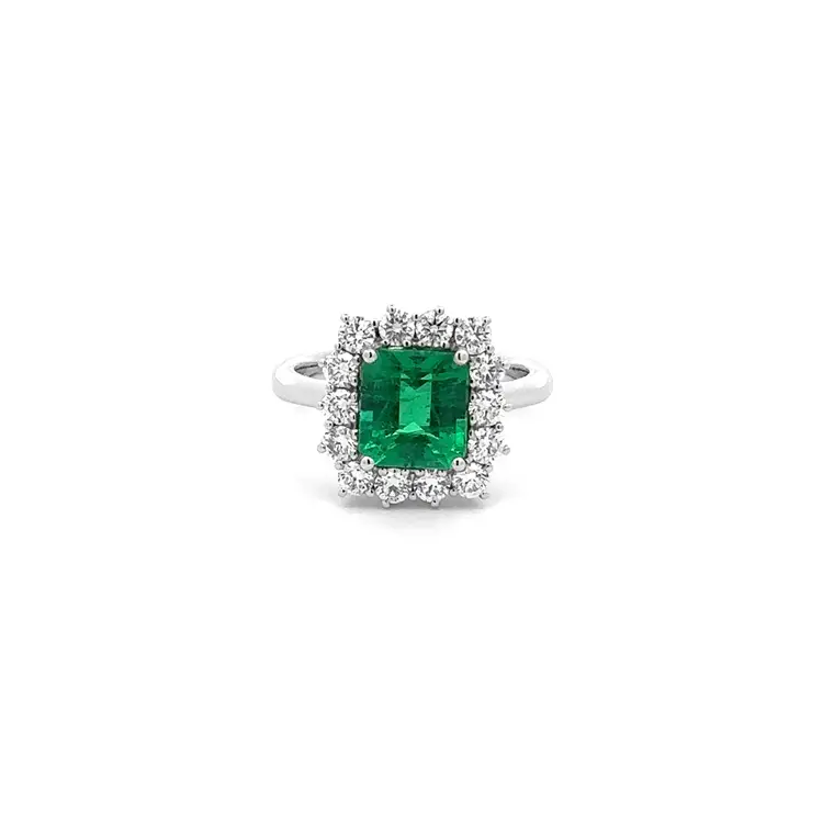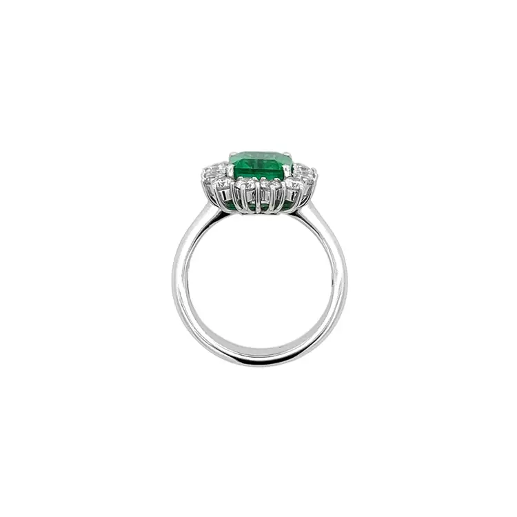 По бокам центрального камня расположены круглые бриллианты общим весом 0,90 карата (цвет G, чистота VS), которые обрамляют смарагд и придают кольцу свет, движение и блеск. Поразительный контраст между живым зелёным камнем и безупречно белым золотом создаёт ощущение сдержанной экстравагантности при вечном стиле.