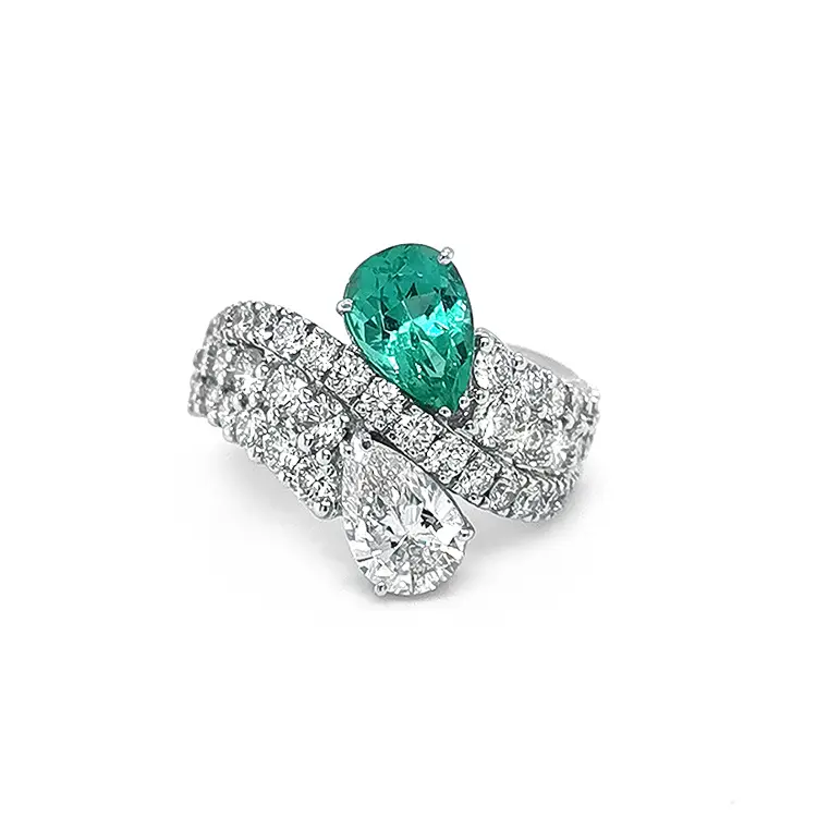 В центре — изумруд 1,34 кт (1 шт.), огранка “груша” (8,40 × 6,60 мм), насыщенно-зелёный (природного происхождения). Второй акцент — бриллиант 1,03 кт (1 шт.), также “груша” (8,80 × 5,80 мм), белый, чистота SI1, цвет F (природный). Дополнительный блеск и объём создаёт обод (halo) из природных бриллиантов 1,84 кт (47 шт.), круглая огранка (Ø 2,40 мм), белые, чистота SI, цвет G. Точная закрепка подчёркивает глубину изумруда и бриллиантовую игру — роскошное, выразительное и вне-временное кольцо, мгновенно притягивающее взгляд.