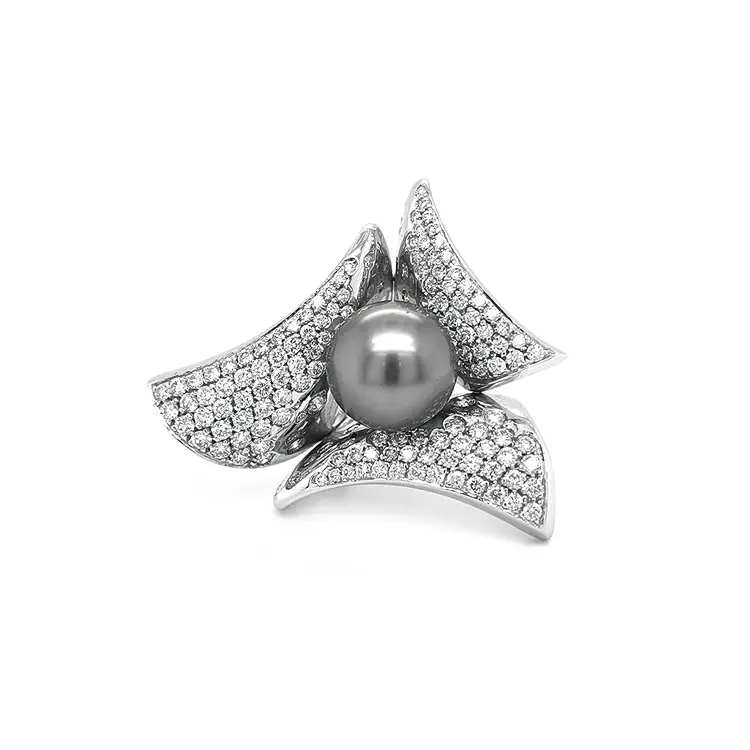 Это кольцо из белого золота с натуральной жемчужиной и бриллиантами от BENY Jewellery — воплощение утончённости и изысканного вкуса. Изготовлено из белого золота 18 карат (750/1000) с зеркальной полировкой, оно сочетает классику и современный шик. Центральный элемент — чёрная жемчужина диаметром 12 мм, символизирующая силу, тайну и утончённую женственность.