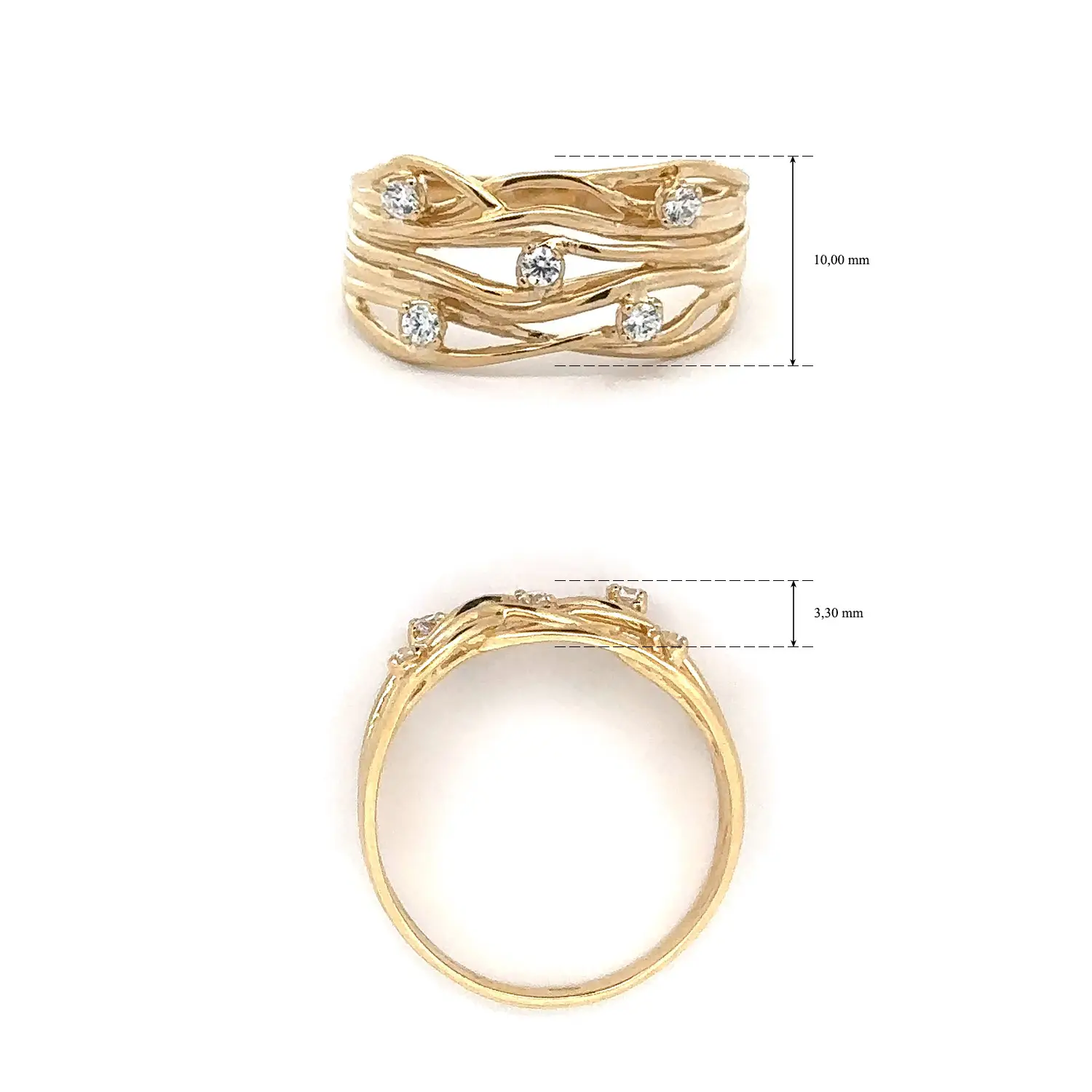 Это элегантное золотое кольцо с переплетённым дизайном очаровывает лёгким, органичным стилем, напоминающим изящно переплетённые веточки. В изогнутую структуру вставлены сияющие цирконы, чей чистый блеск прекрасно сочетается с тёплым оттенком жёлтого золота. Продуманное расположение камней придаёт кольцу воздушность, игривость и женственную мягкость.