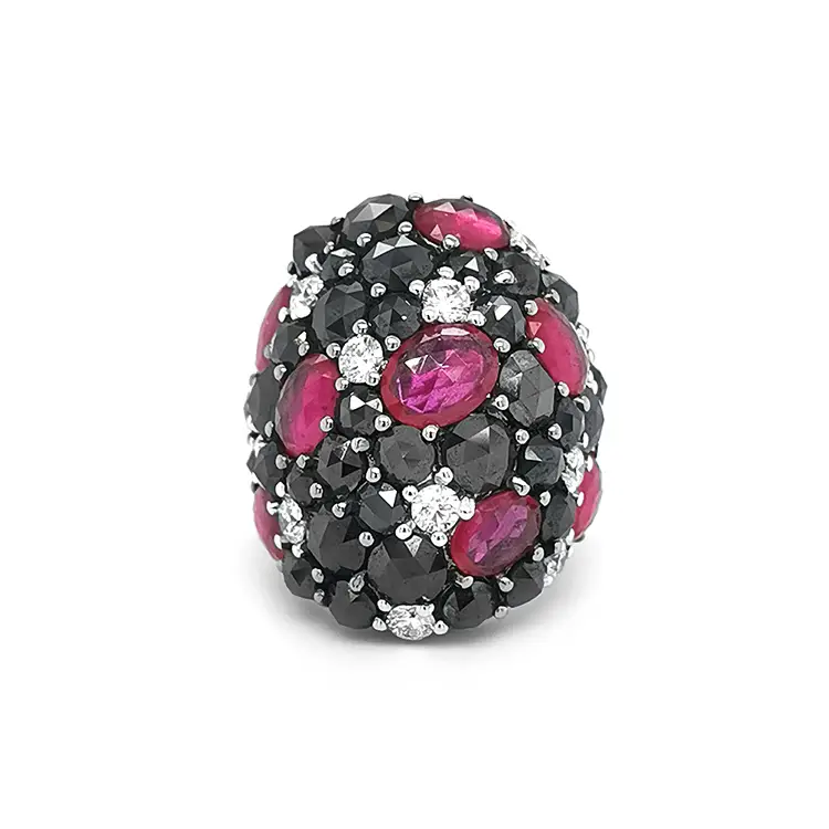 Это кольцо из 18-каратного чёрного золота (750/1000) с рутениевым покрытием — подлинный символ современной экстравагантности. Полированная поверхность и мощная композиция подчёркивают контраст тёмных тонов и насыщенно-красных оттенков, создавая украшение, которое мгновенно притягивает взгляд и становится доминантой любого образа.