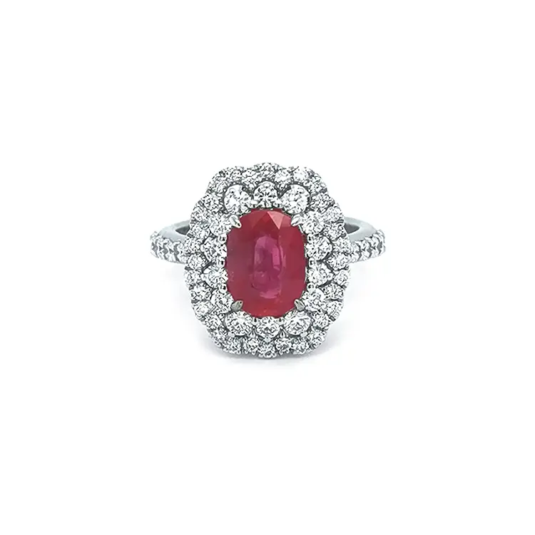 В центре — натуральный рубин 2,05 кт (1 шт.), овальная огранка (6,70 × 6,65 мм), интенсивно-красный. Блеск и контраст обеспечивают природные бриллианты 1,11 кт (60 шт.) круглой огранки (1,80–2,20 мм), белые, чистота SI, цвет G. Точная закрепка подчеркивает насыщенность рубина и бриллиантовое сияние окантовки — результатом становится роскошное, выразительное и вне-временное помолвочное кольцо, превращающее признание в любви в незабываемый миг.