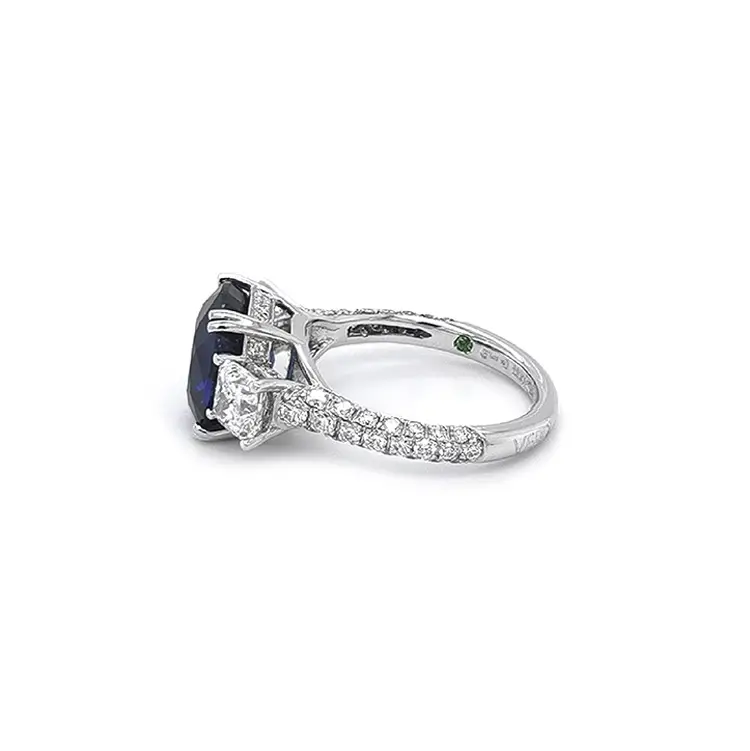 В центре – натуральный сапфир весом 5,57 карата, огранка Cushion (10,60 × 9,64 мм), чей глубокий синий цвет олицетворяет спокойствие и величие. С двух сторон его украшают два бриллианта огранки Cushion (1,40 карата, цвет E, чистота VVS1), а по периметру вставлены 64 круглых бриллианта (0,72 карата, цвет F–G), создающие восхитительное сияние.