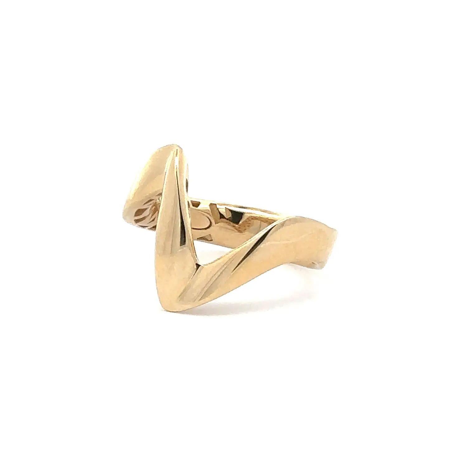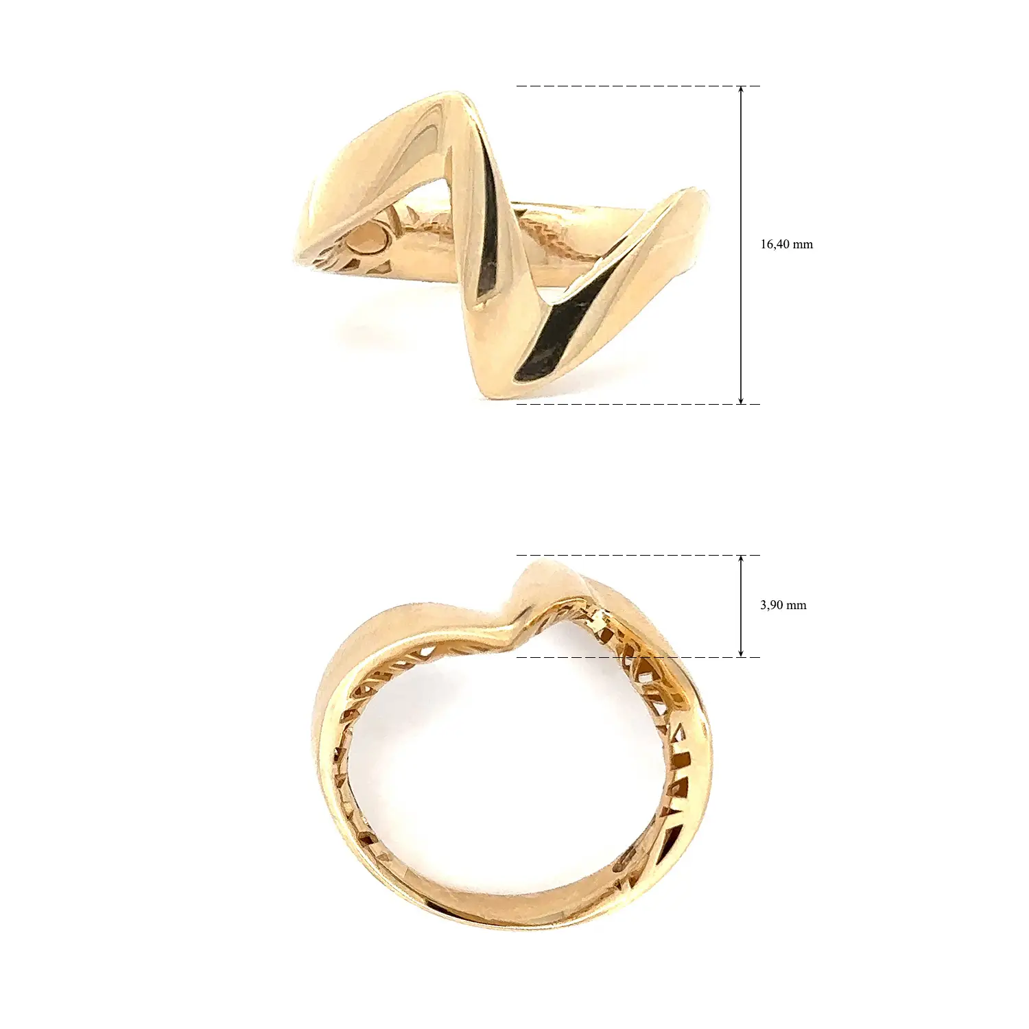 Это эффектное кольцо выделяется своей асимметричной геометрией, создающей элегантную линию с сочетанием острых и плавных переходов. Высокая полировка желтого золота подчеркивает современный характер украшения и акцентирует его динамичный силуэт, заметно отличающийся от классических моделей. Выразительная форма с легким архитектурным акцентом придаёт кольцу смелый и современный стиль.