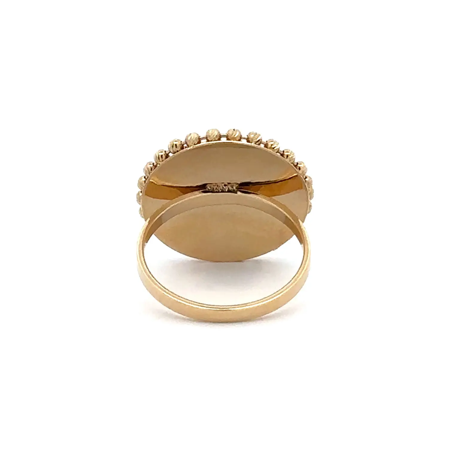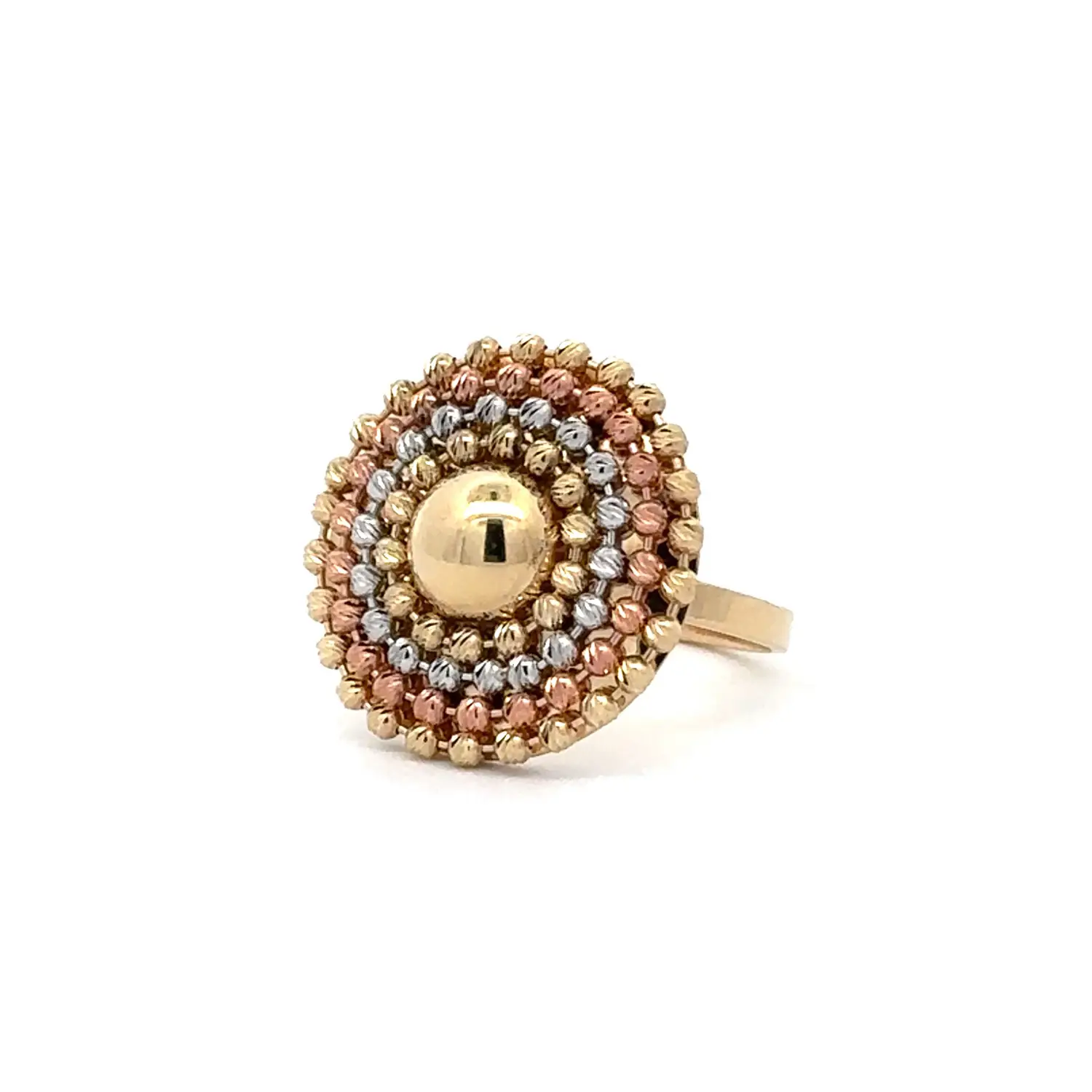 Это эффектное кольцо объединяет жёлтое, белое и розовое золото 14 карат, оформленные в богатый текстурный круглый дизайн. Гладкий центральный купол окружён несколькими рядами мельчайших гранулированных деталей, создающих красивый объёмный эффект и игру света. Кольцо напоминает элегантную мозаику и сразу привлекает внимание.