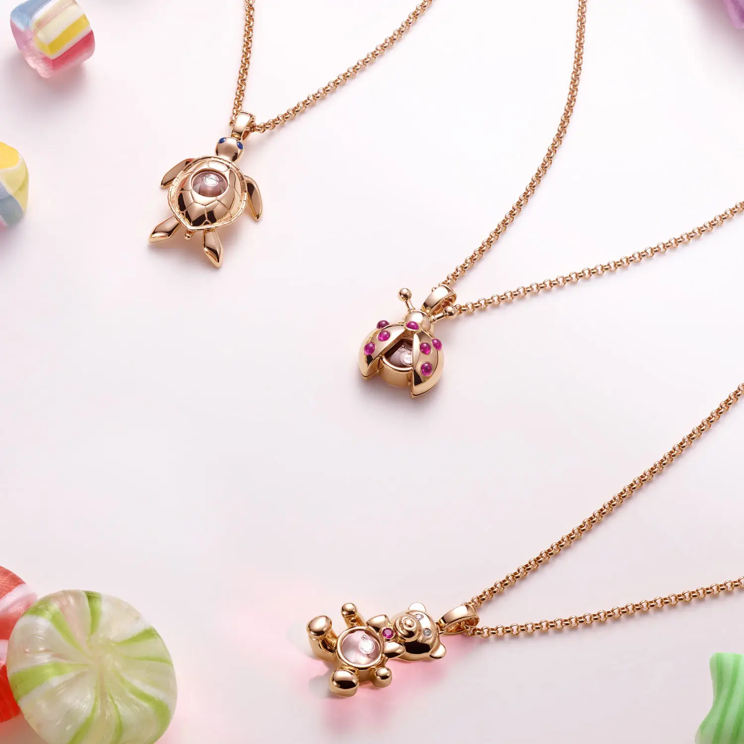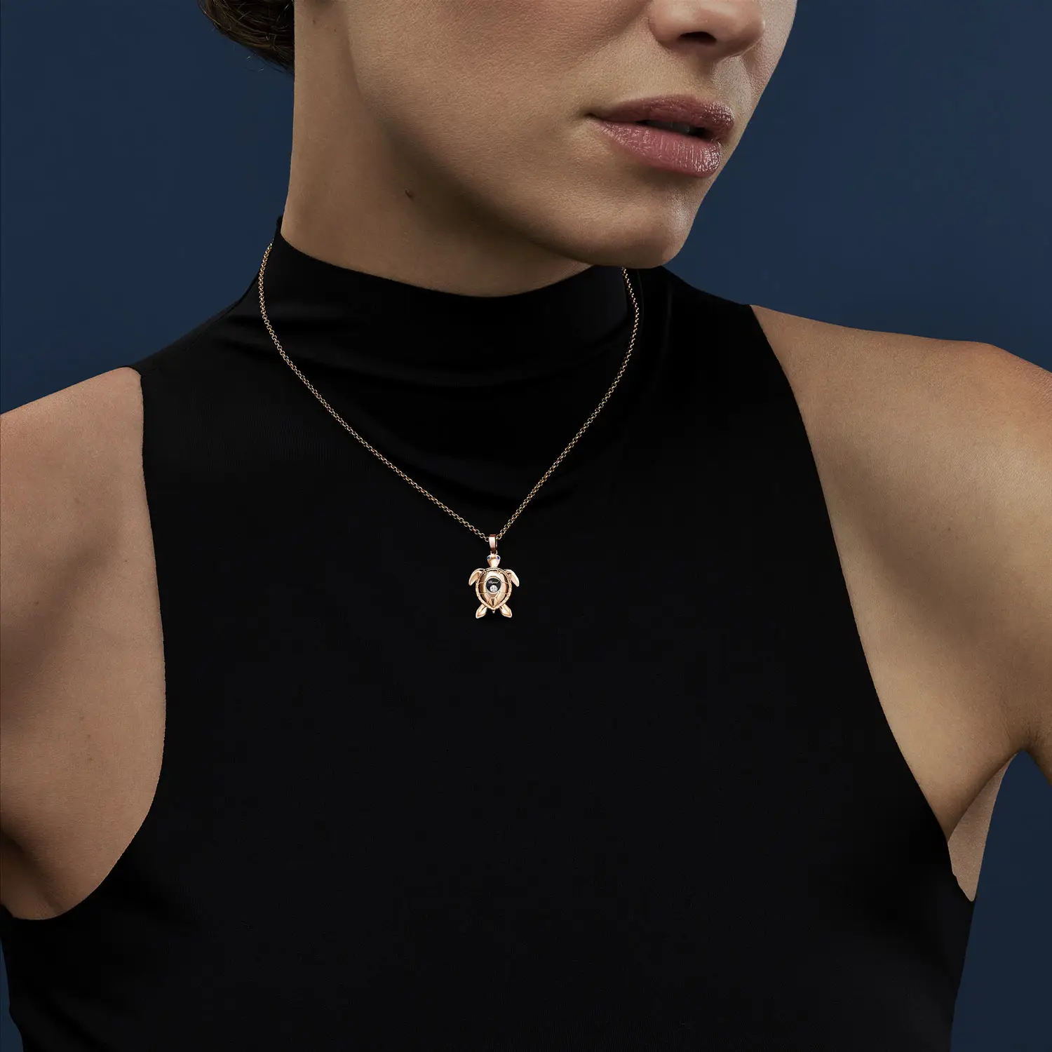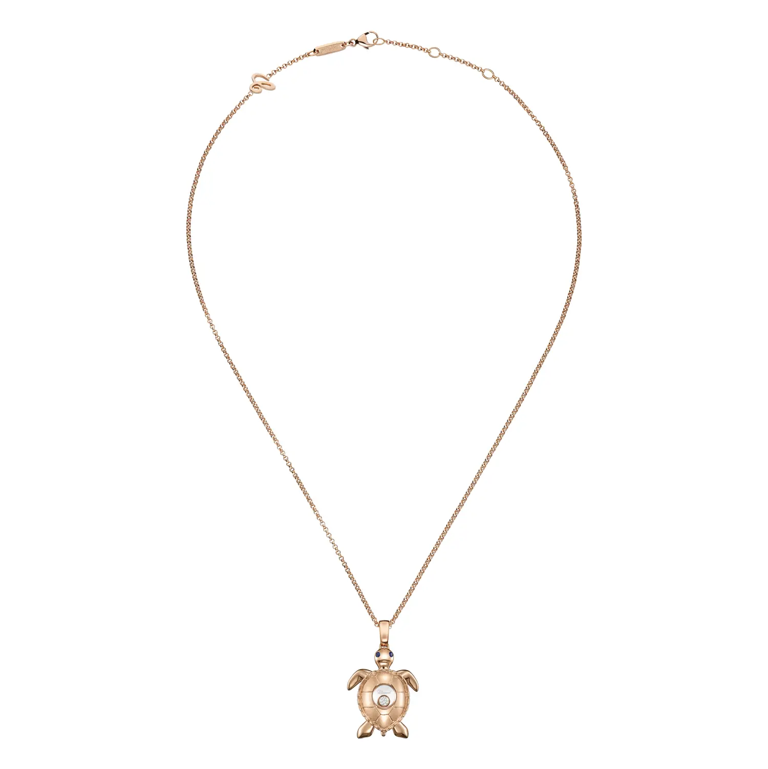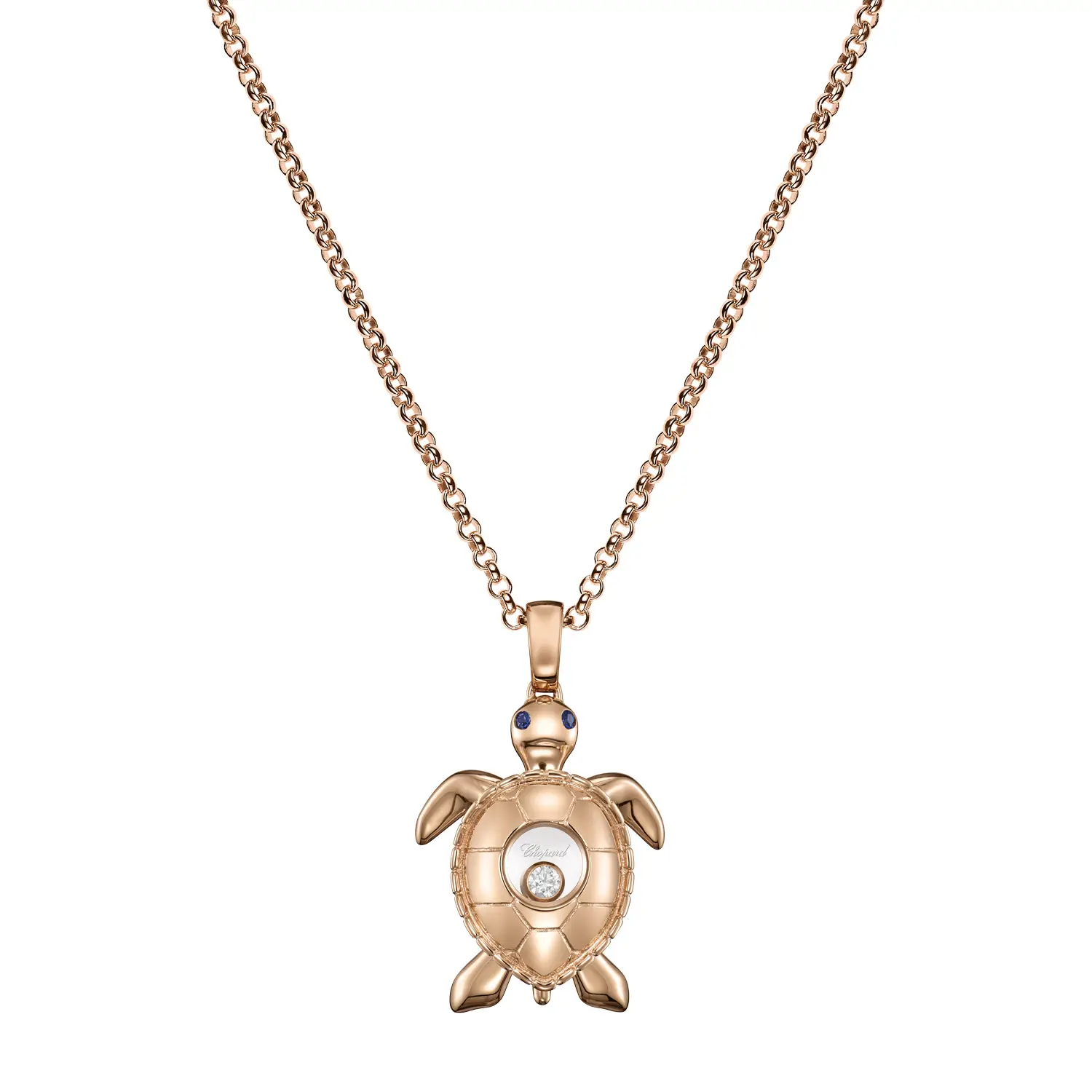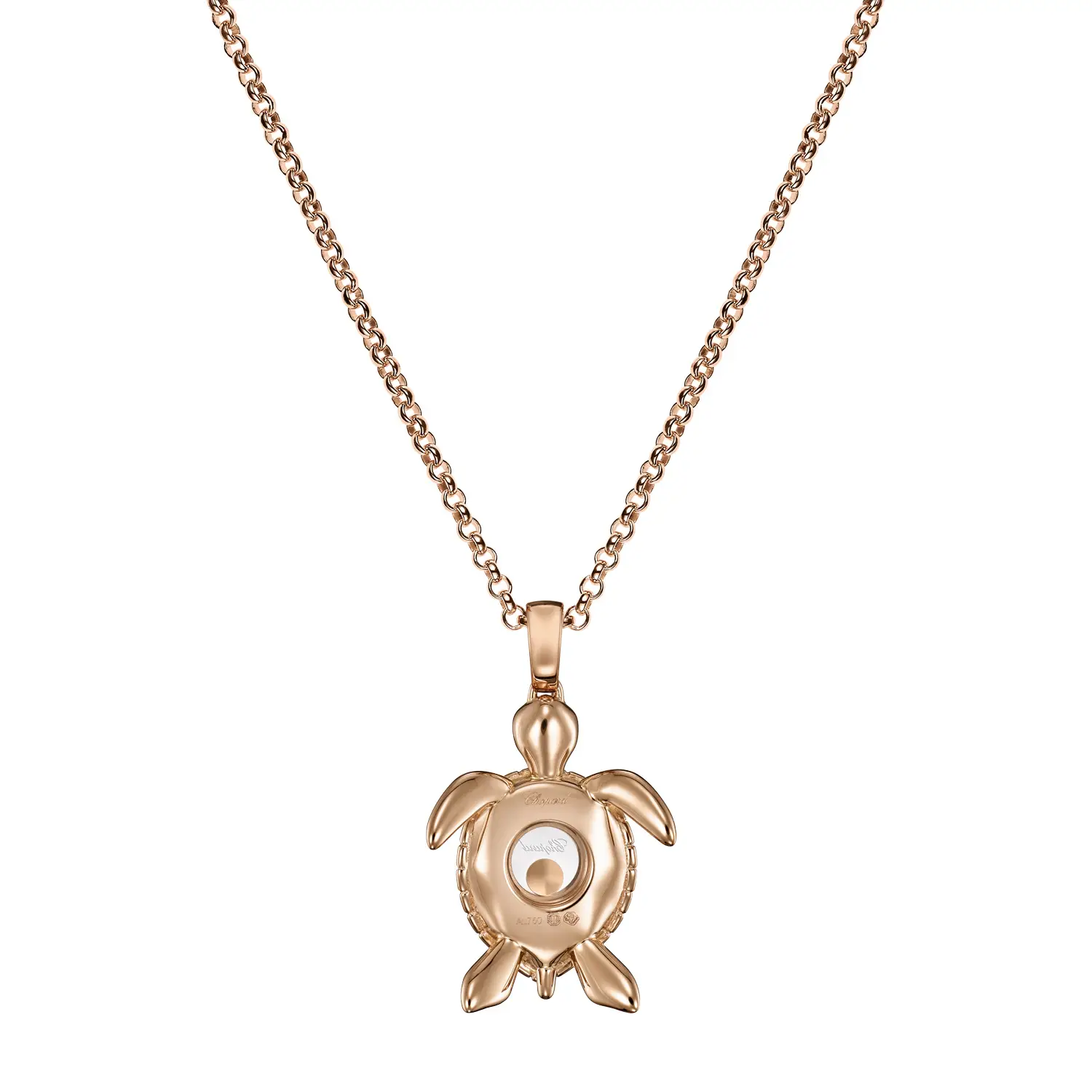 Кулон Chopard Happy Diamonds Turtle 79A187-5001 воплощает символику удачи, долголетия и элегантности, объединяя игривый дух коллекции Happy Diamonds с утончённым мастерством Chopard. Изготовлен из этичного розового золота 18 карат, украшен подвижным бриллиантом, заключённым между двумя сапфировыми стёклами, что создаёт живую игру света.