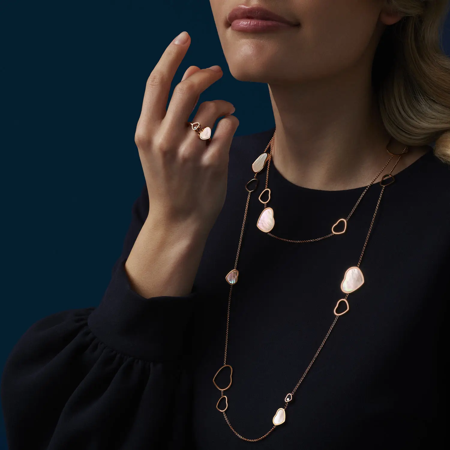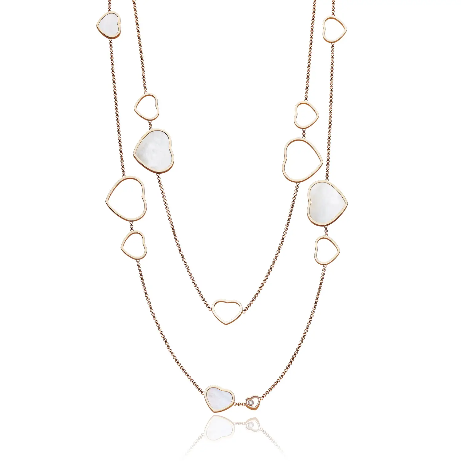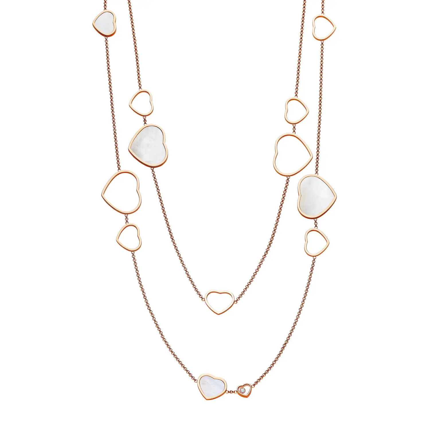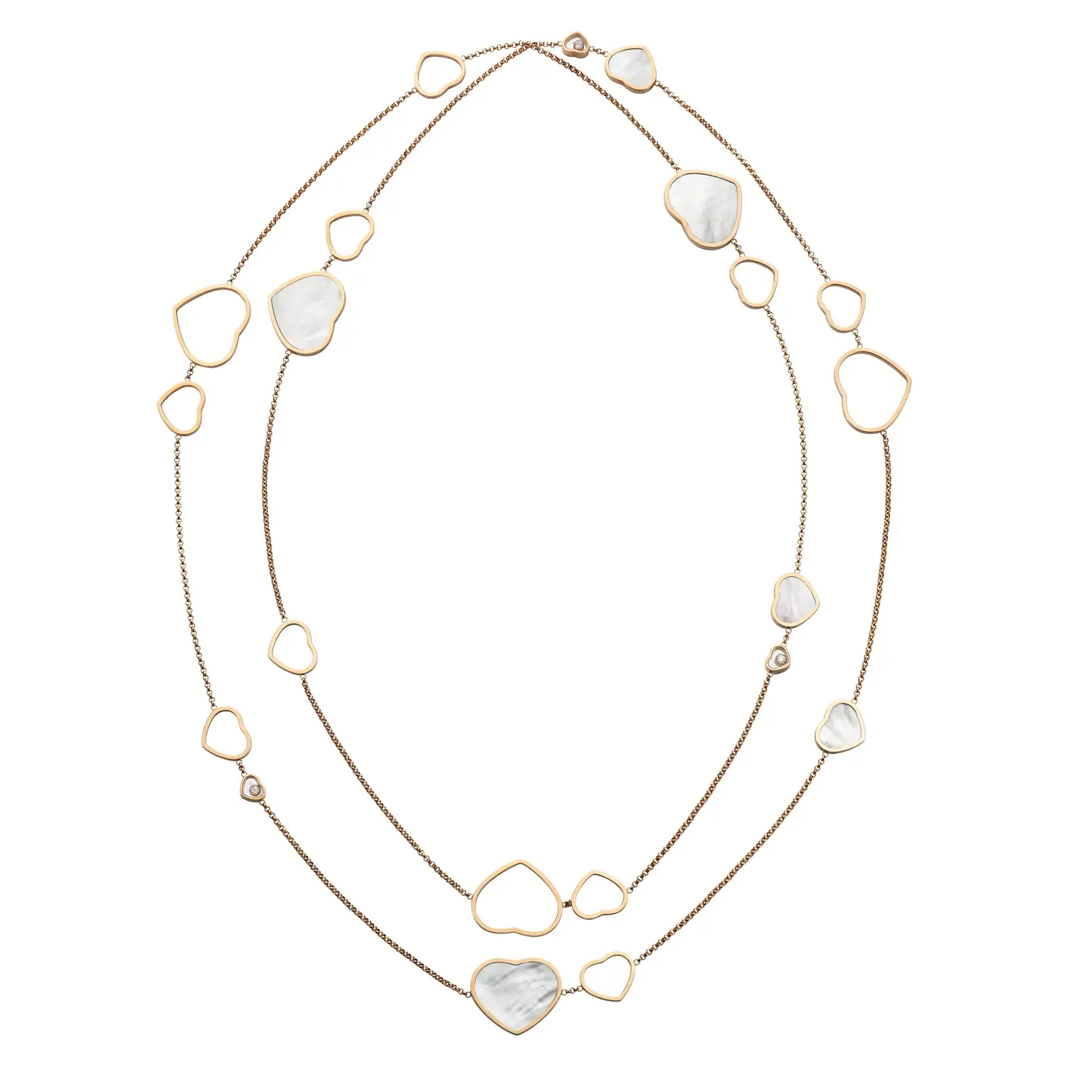 Это изысканное ожерелье из коллекции Happy Hearts воплощает гармонию игривости и элегантности. Изготовлено из 18-каратного розового золота и украшено мотивами сердец из натурального перламутра, дополненными бриллиантами общим весом около 0,15 карата. Каждая деталь отражает фирменный стиль Chopard – воплощение любви, счастья и женственности в роскошной форме.