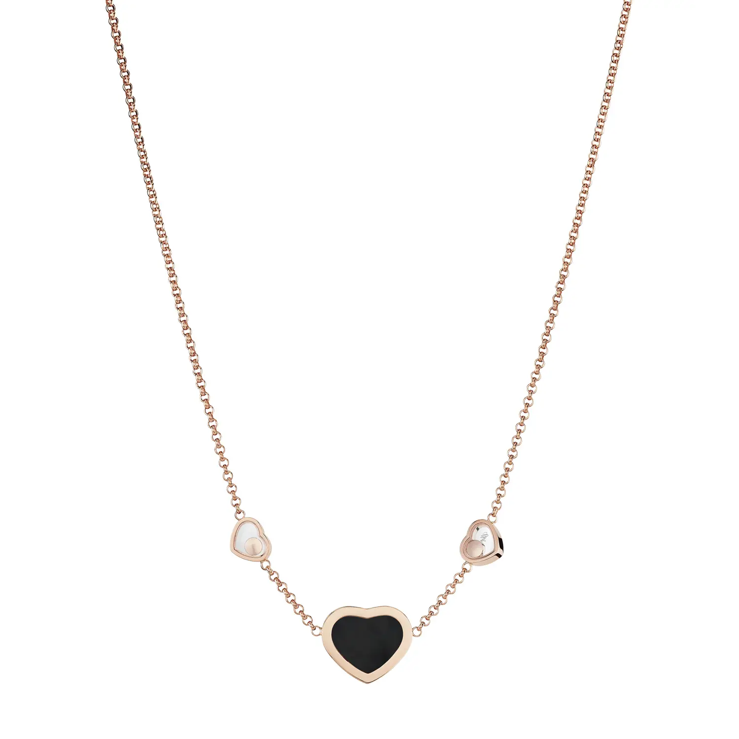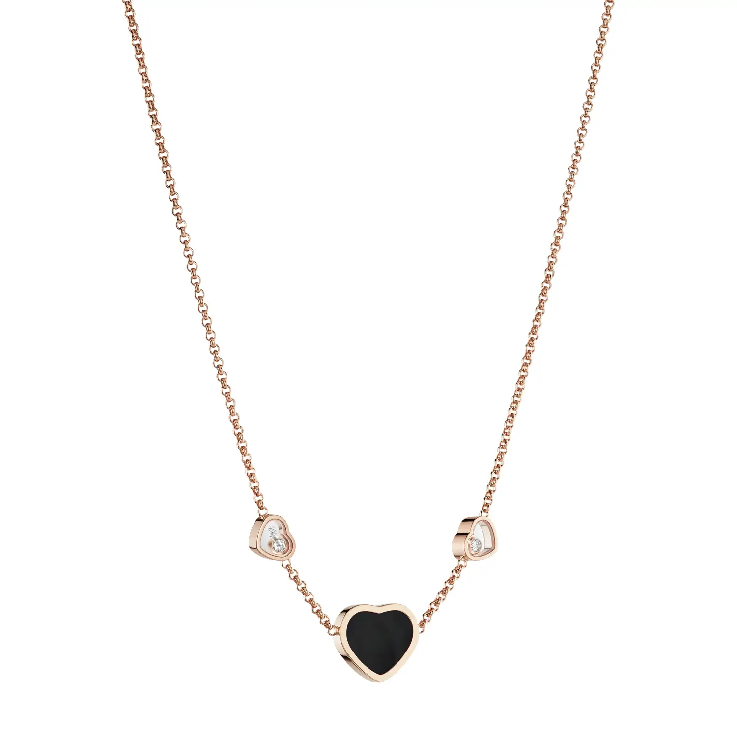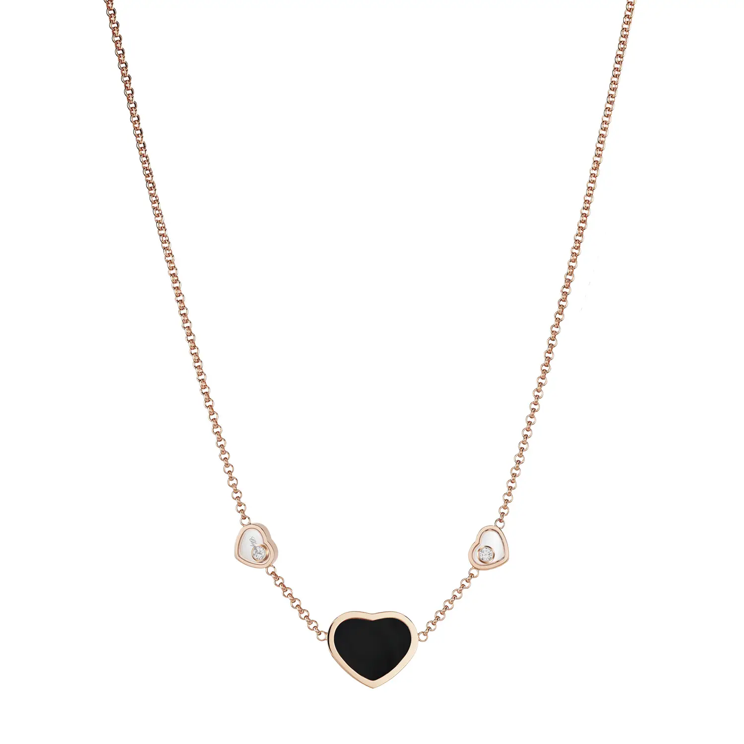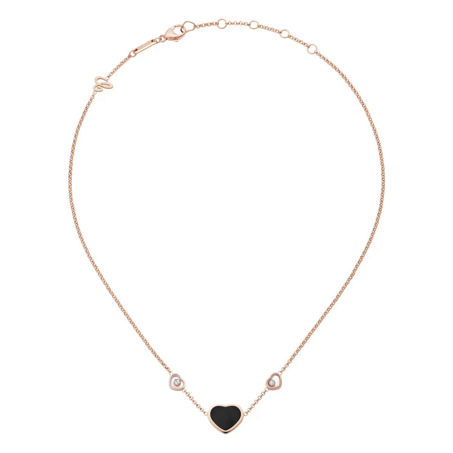 Это элегантное ожерелье из коллекции Happy Hearts воплощает гармонию любви и современного роскоши. Изготовлено из 18-каратного розового золота, украшено сердцем из чёрного оникса и двумя сверкающими бриллиантами общим весом около 0,11 карата, создающими изысканный контраст и символизирующими силу и нежность.