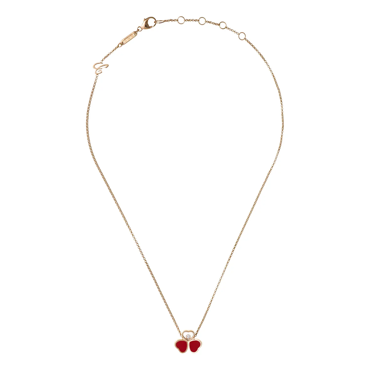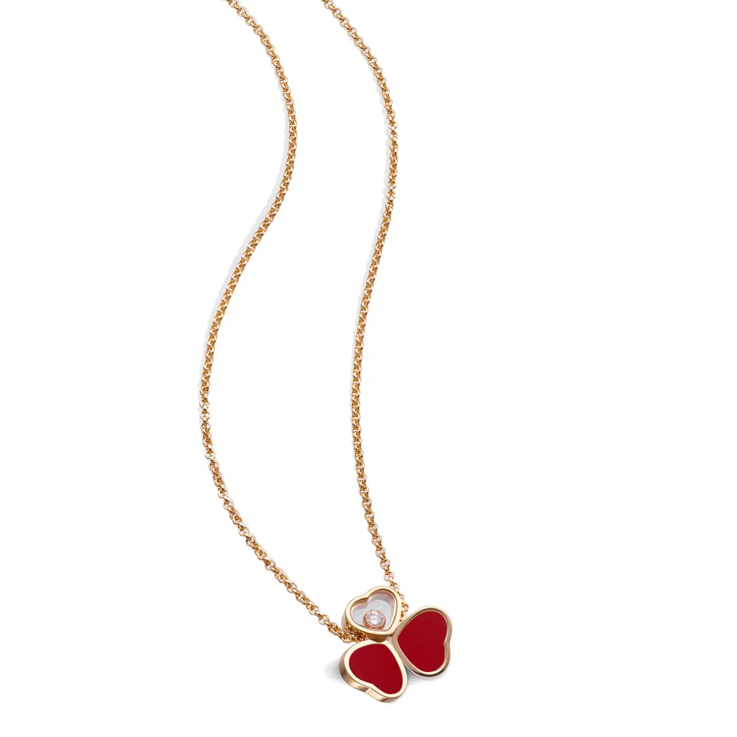Колье Chopard Happy Hearts Wings 81A083-5811 — это поэтичное воплощение лёгкости, элегантности и радости. Изготовлено из этичного розового золота 18 карат, украшено двумя сердцами из красного сердолика и подвижным бриллиантом в центральном сердце. Форма крыльев бабочки символизирует свободу, нежность и женственность.