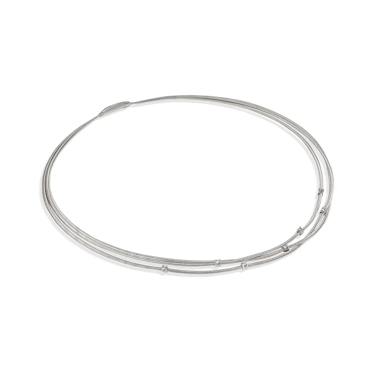 Колье Marco Bicego Goa CG617 B W 01 воплощает изысканное сочетание современного дизайна и итальянского ювелирного мастерства. Изготовлено из белого золота 18 карат (750/1000) с глянцевой и матовой отделкой, что придаёт украшению особую глубину и благородный блеск. Длина 41 см идеально подчёркивает линию шеи и добавляет образу утончённости.