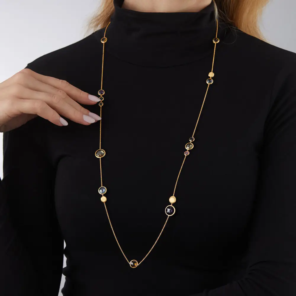 Колье Marco Bicego Jaipur CB1401 MIX01 Y — воплощение гармонии природной красоты и итальянского мастерства. Изготовлено из жёлтого золота 18 карат (750/1000) с глянцевой и матовой отделкой, что придаёт изделию мягкое сияние и утончённый блеск. Длина 92 см делает колье универсальным — его можно носить длинным или обернуть дважды вокруг шеи.