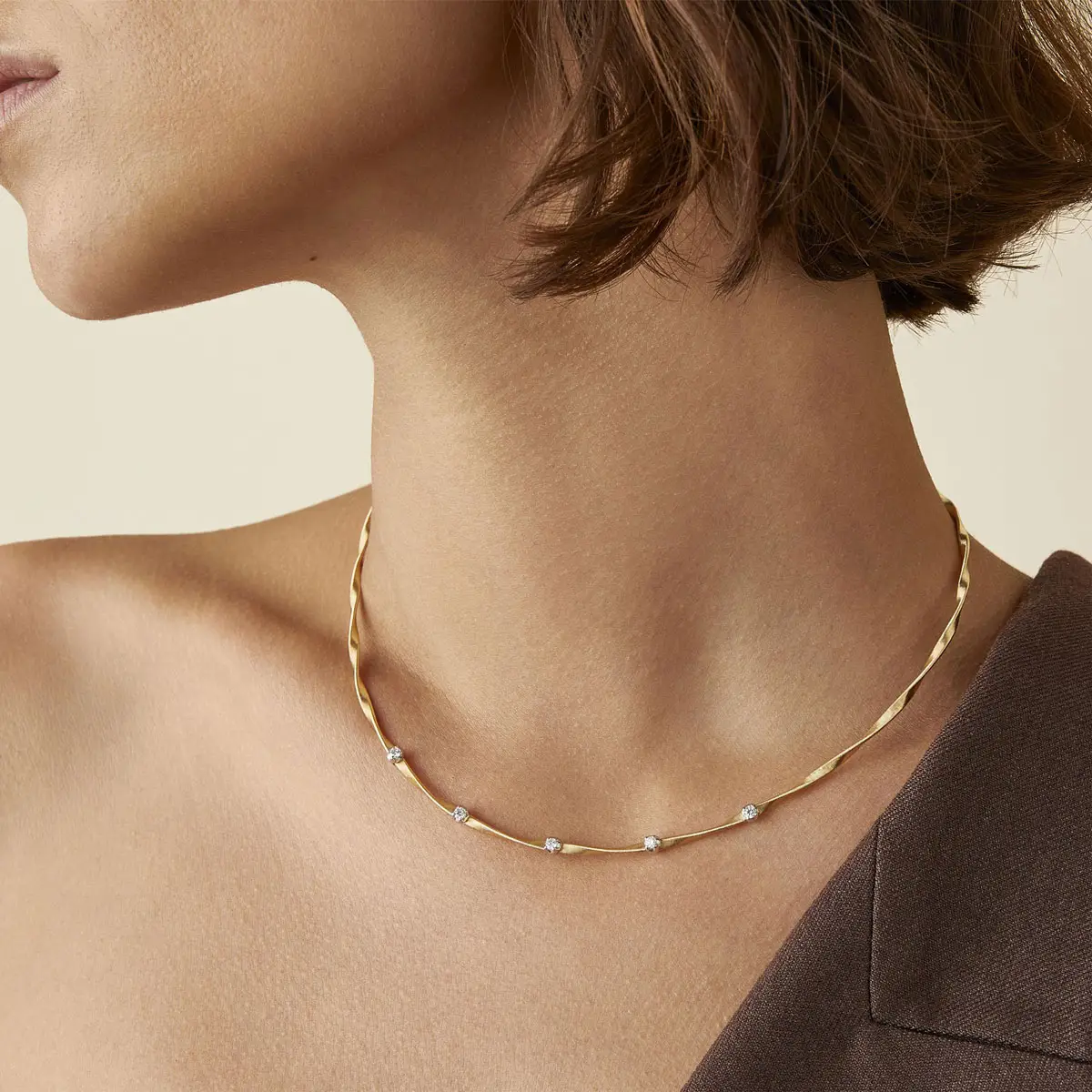 Каждое изделие выполнено из золота 750-й пробы и украшено фирменной техникой ручного скручивания проволоки, которая является визитной карточкой Marco Bicego. Этот приём придаёт украшениям подвижность, текстуру и глубину, благодаря чему они выглядят живыми и неповторимыми. Marrakech включает ожерелья, браслеты, серьги и кольца, нередко дополненные бриллиантами для ещё большего сияния.