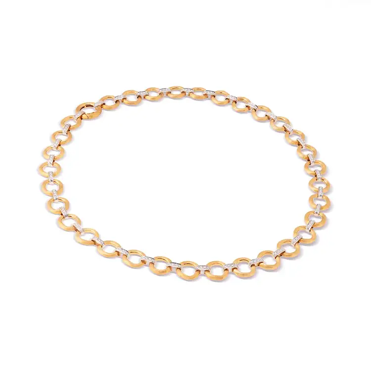 Колье Marco Bicego Jaipur Diamond CB2660-B YW — воплощение итальянской элегантности и женственности. Украшение выполнено из жёлтого золота 18 карат (750/1000) с матовой поверхностью, что придаёт изделию мягкое сияние и утончённость. Длина 45 см позволяет колье элегантно лежать на шее, подчёркивая линию декольте.