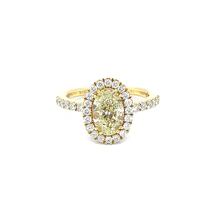 В центре — натуральный бриллиант 2,02 кт (1 шт.), овальная огранка (8,90 × 6,60 мм), Fancy Yellow. Блеск и контраст создают обод и плечики, усыпанные природными бриллиантами 0,52 кт (32 шт.), круглая огранка (Ø 1,65 мм), белые, чистота VS1, цвет I. Точная закрепка усиливает и насыщенность центрального камня, и блеск окружающих — результатом становится вневременное, выразительное и романтичное помолвочное кольцо, превращающее признание в любви в незабываемый миг.