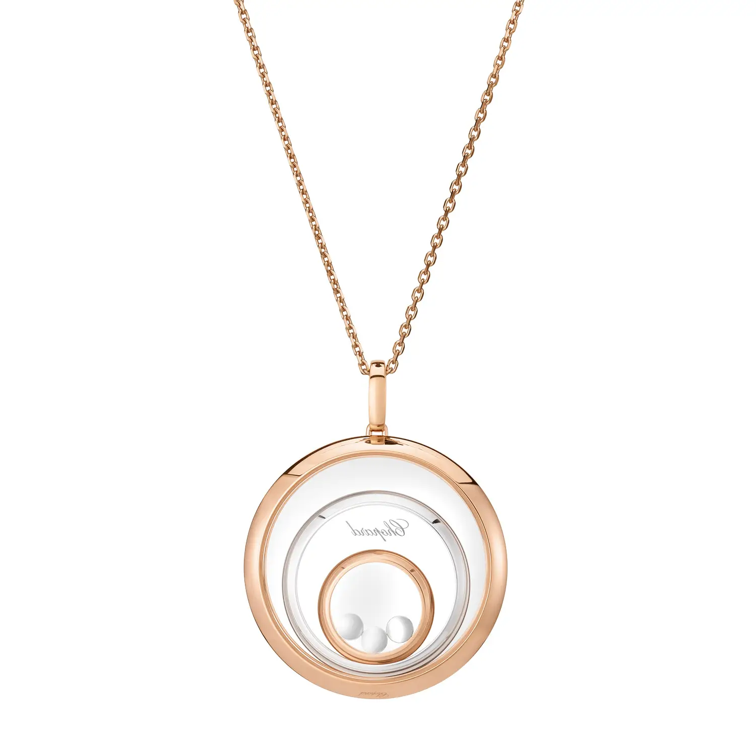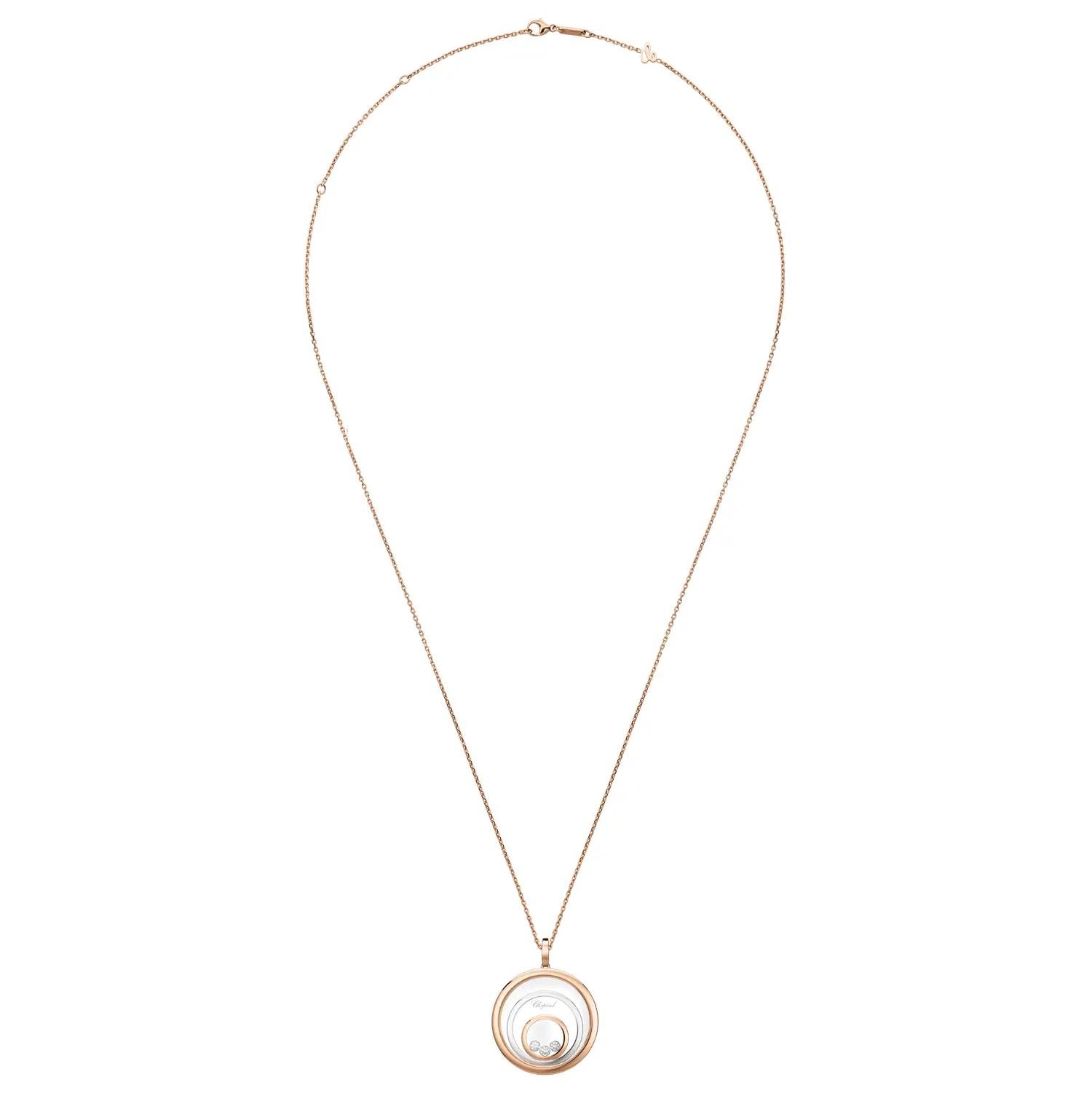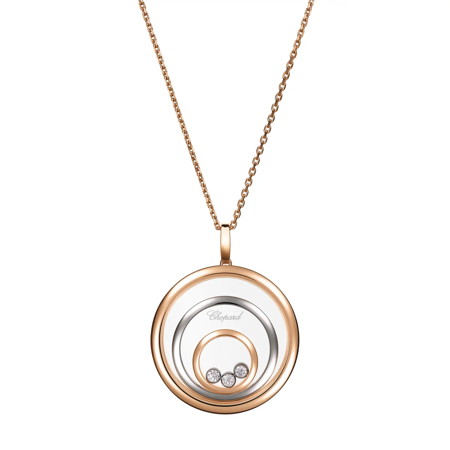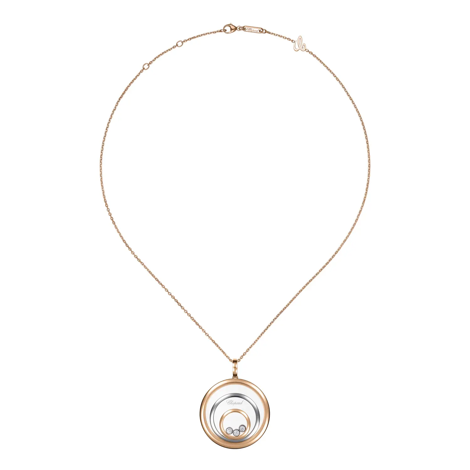 Кулон Chopard Happy Spirit 798232-9001 — это дань женственной гармонии, движению и свету. Украшение выполнено из сочетания этичного розового и белого золота 18 карат, создающего утончённый контраст оттенков. В центре между двумя сапфировыми стёклами свободно движется бриллиант, окружённый концентрическими кольцами с дополнительными бриллиантами общим весом 0,28 карата — знаменитый эффект «танцующего бриллианта», символ свободы и радости.
