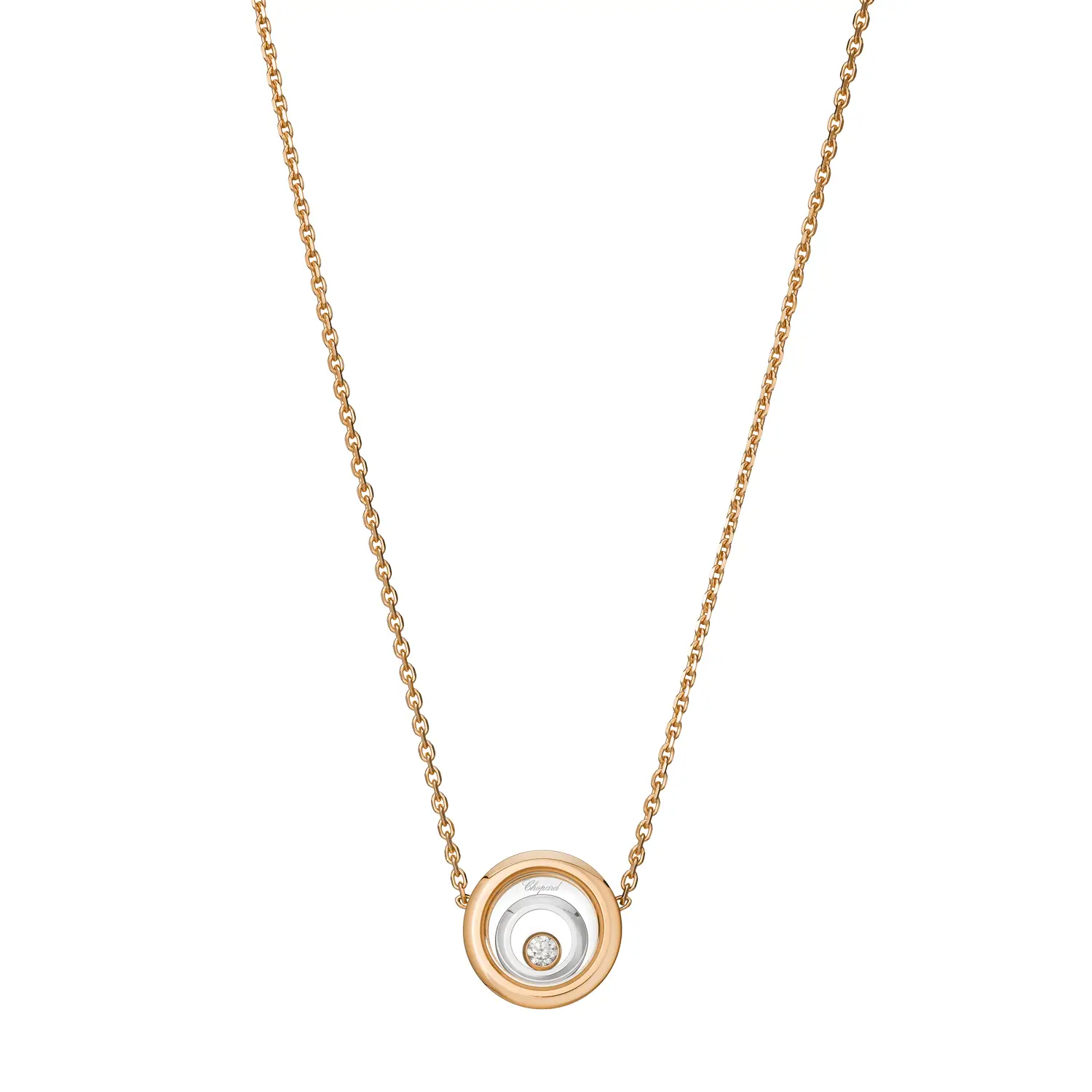 Это элегантное ожерелье из коллекции Happy Spirit объединяет вечную эстетику Chopard с женственностью и лёгкой энергией. Изготовлено из комбинации 18-каратного розового и белого золота, украшено свободно движущимся бриллиантом весом около 0,09 карата, который создаёт завораживающую игру света при каждом движении. Концентрические круги символизируют гармонию, равновесие и бесконечный ритм жизни.