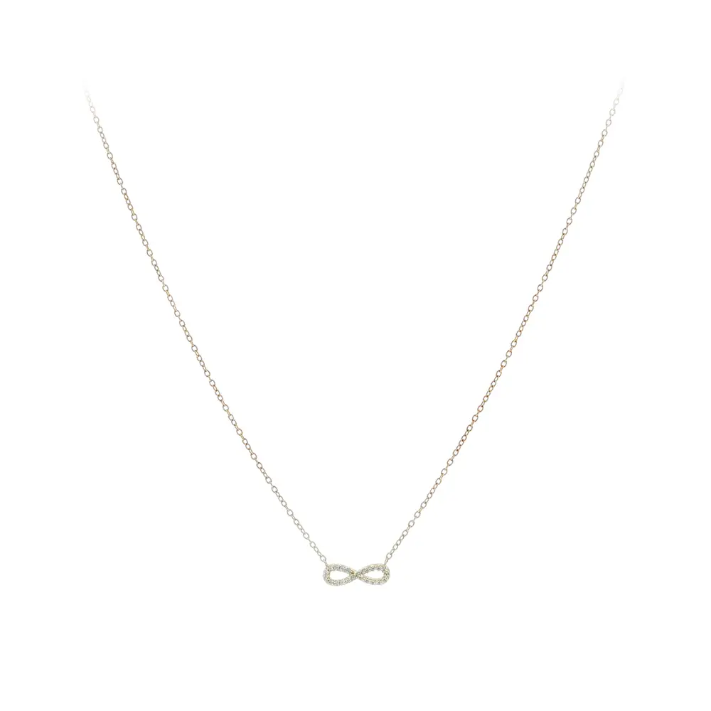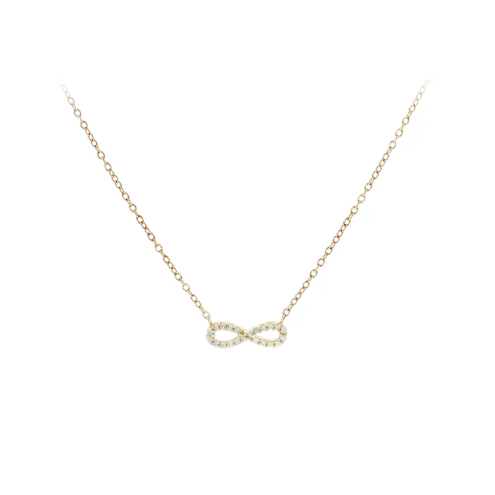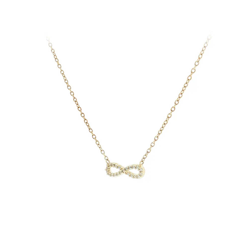 Это золотое ожерелье с символом бесконечности — элегантное украшение, символизирующее вечность, любовь и связь. Нежный кулон украшен сверкающими цирконами, которые придают изделию роскошный блеск.