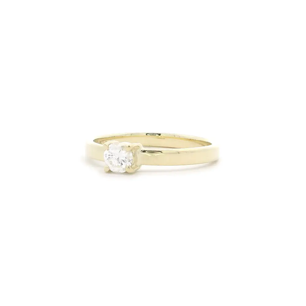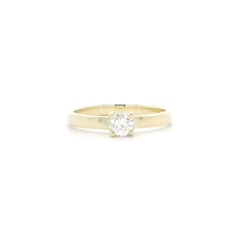 Это помолвочное кольцо из жёлтого золота 18 карат олицетворяет вечную элегантность и символ любви. В центре сияет солитерный бриллиант весом 0,24 карата, блестящая огранка которого подчёркивает природную красоту и игру света.