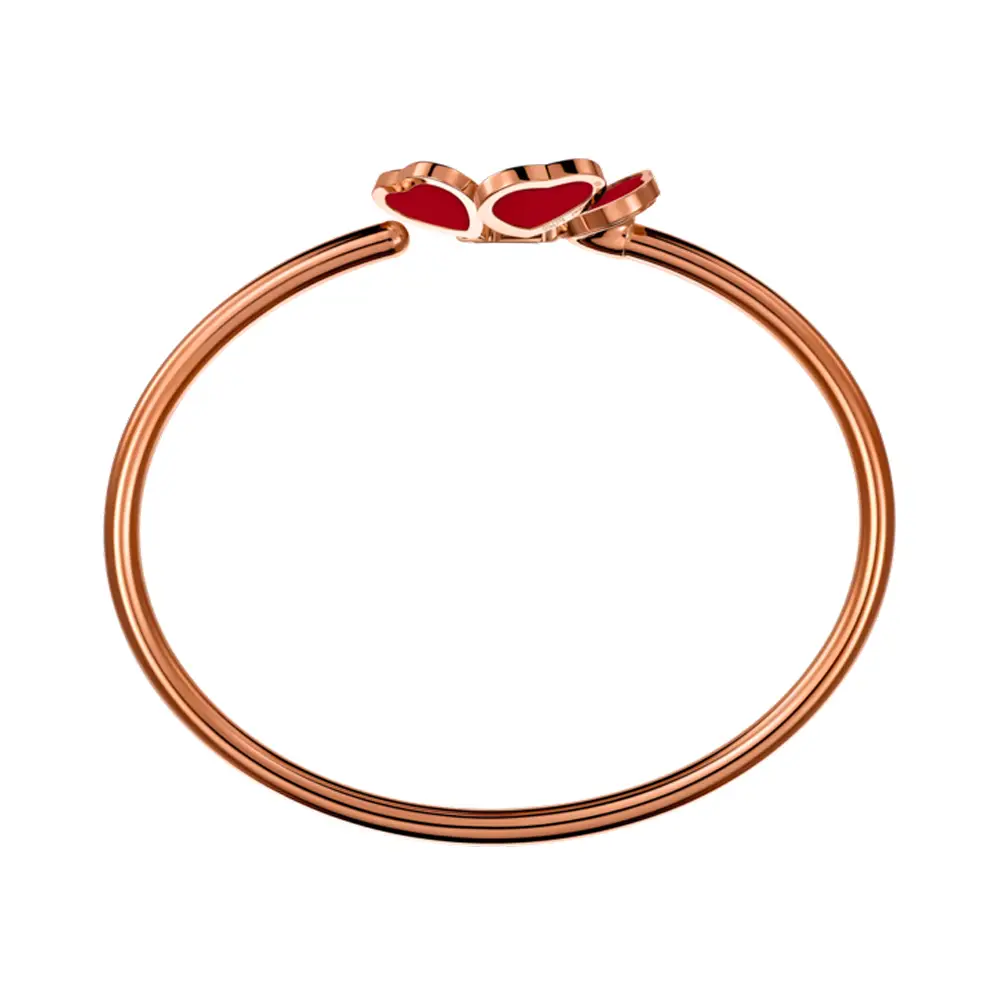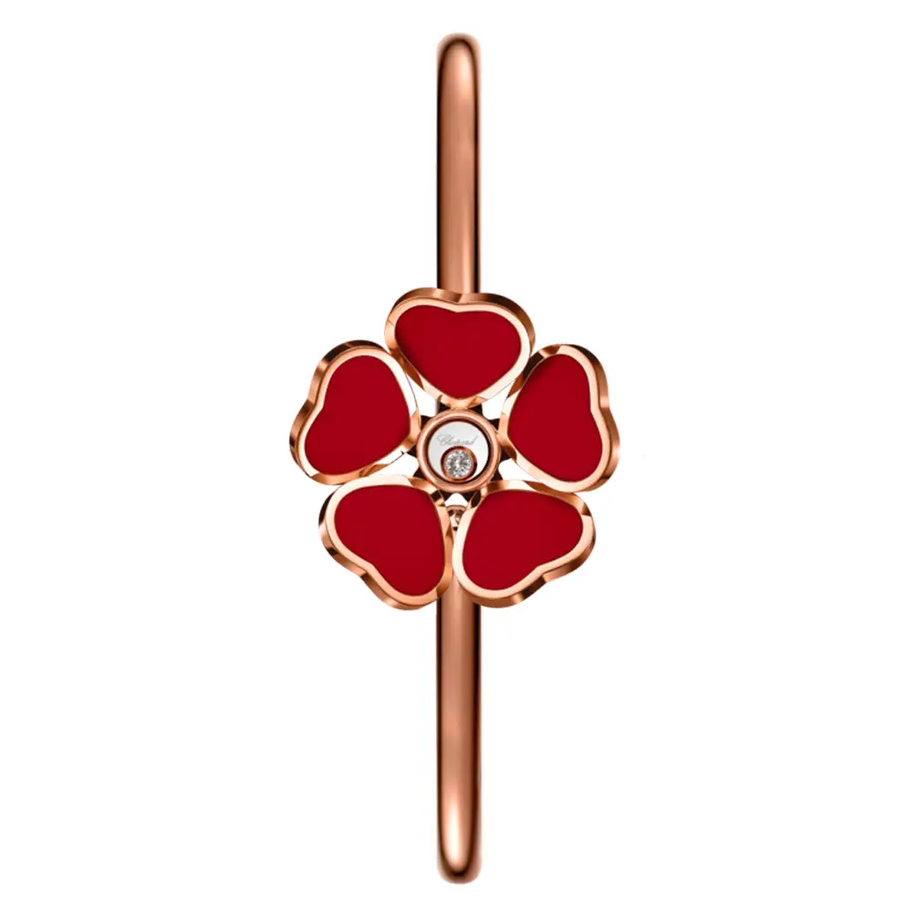 Браслет изготовлен из розового золота 18 карат и украшен плавающим бриллиантом (0,05 карата), сверкающим при каждом движении, а также красным сердцем из камня и цветочным элементом. Его длина 17 см обеспечивает элегантную посадку на запястье. Каждая деталь отражает мастерство и жизнерадостный дух коллекции Happy Hearts Flowers.
