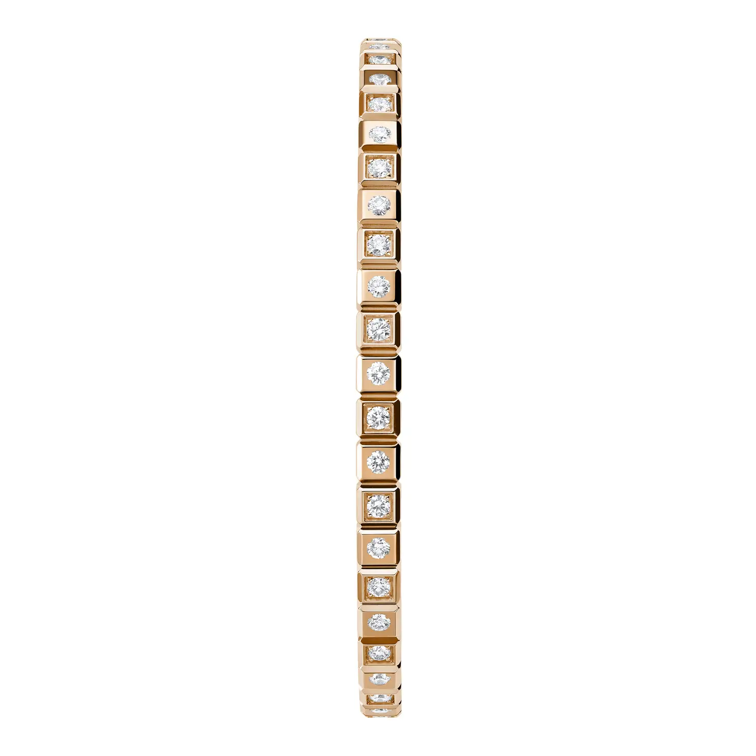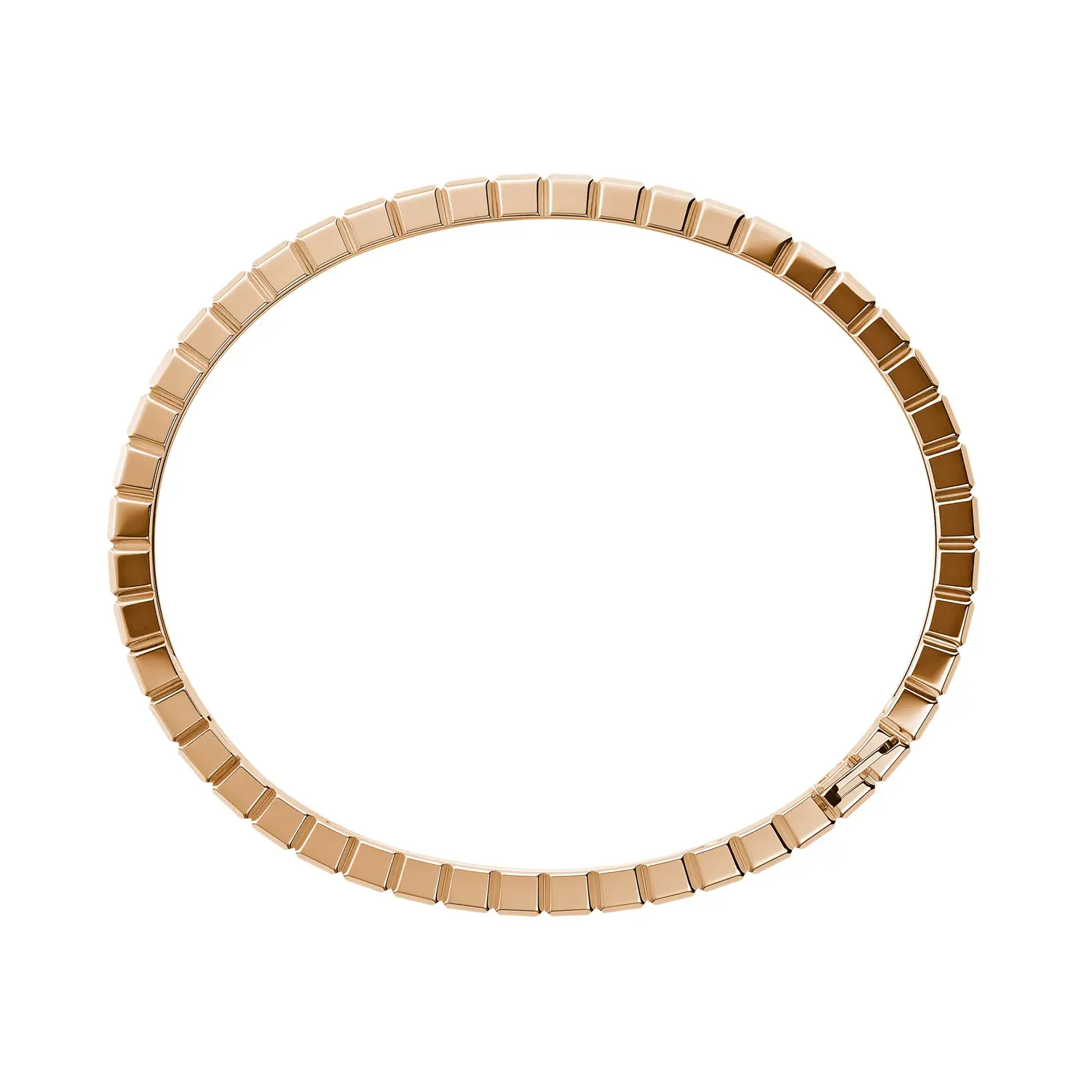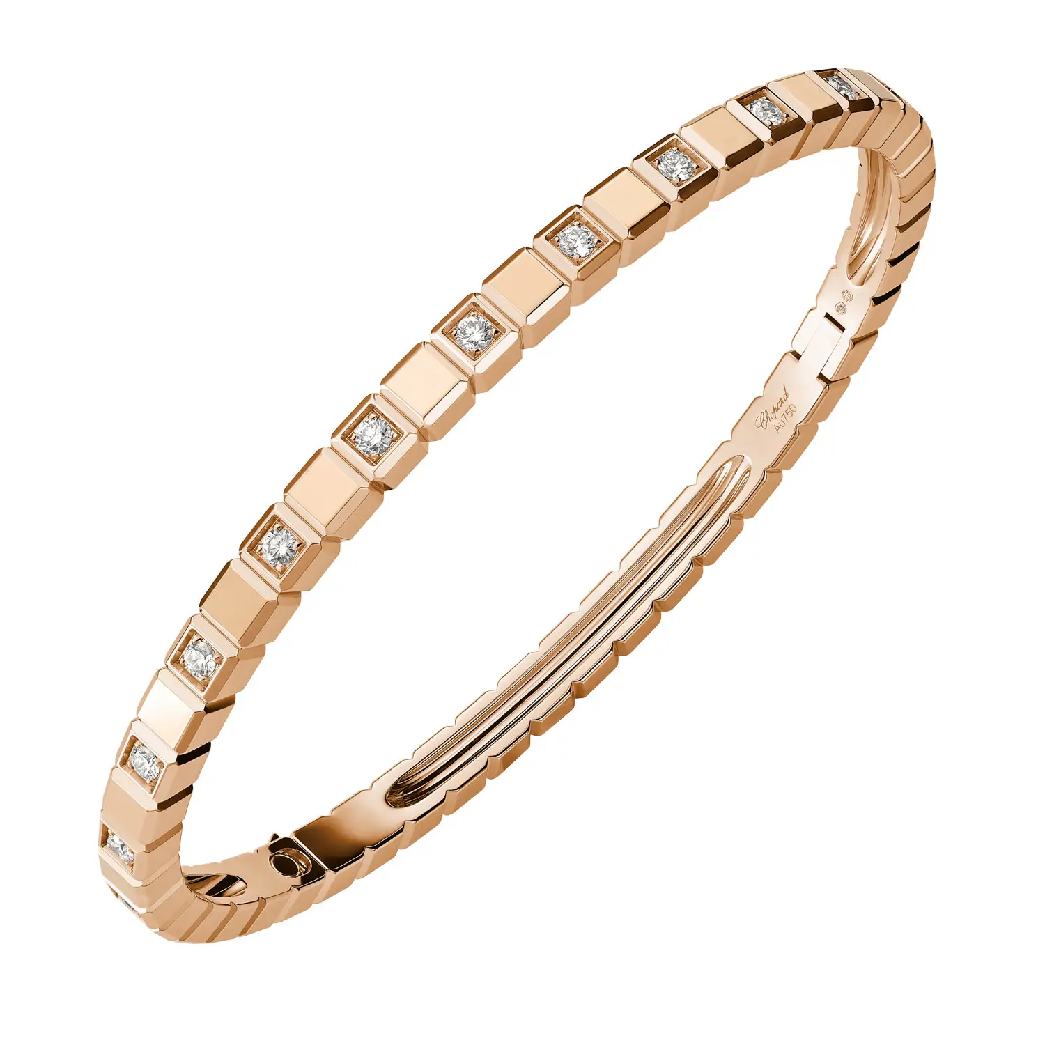 Браслет Chopard Ice Cube из 18-каратного этичного розового золота воплощает изысканную элегантность и современную роскошь. Его дизайн вдохновлён культовым мотивом куба, символом совершенства и гармонии. Поверхность из тонко отполированных граней создаёт нежную игру света при каждом движении, а бриллианты общим весом около 0,77 карата придают украшению сияющий блеск.