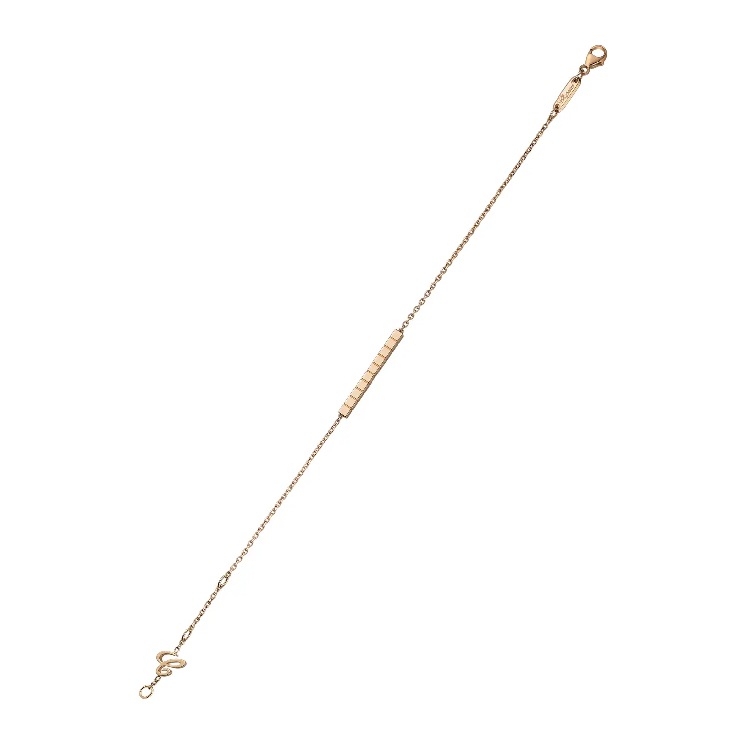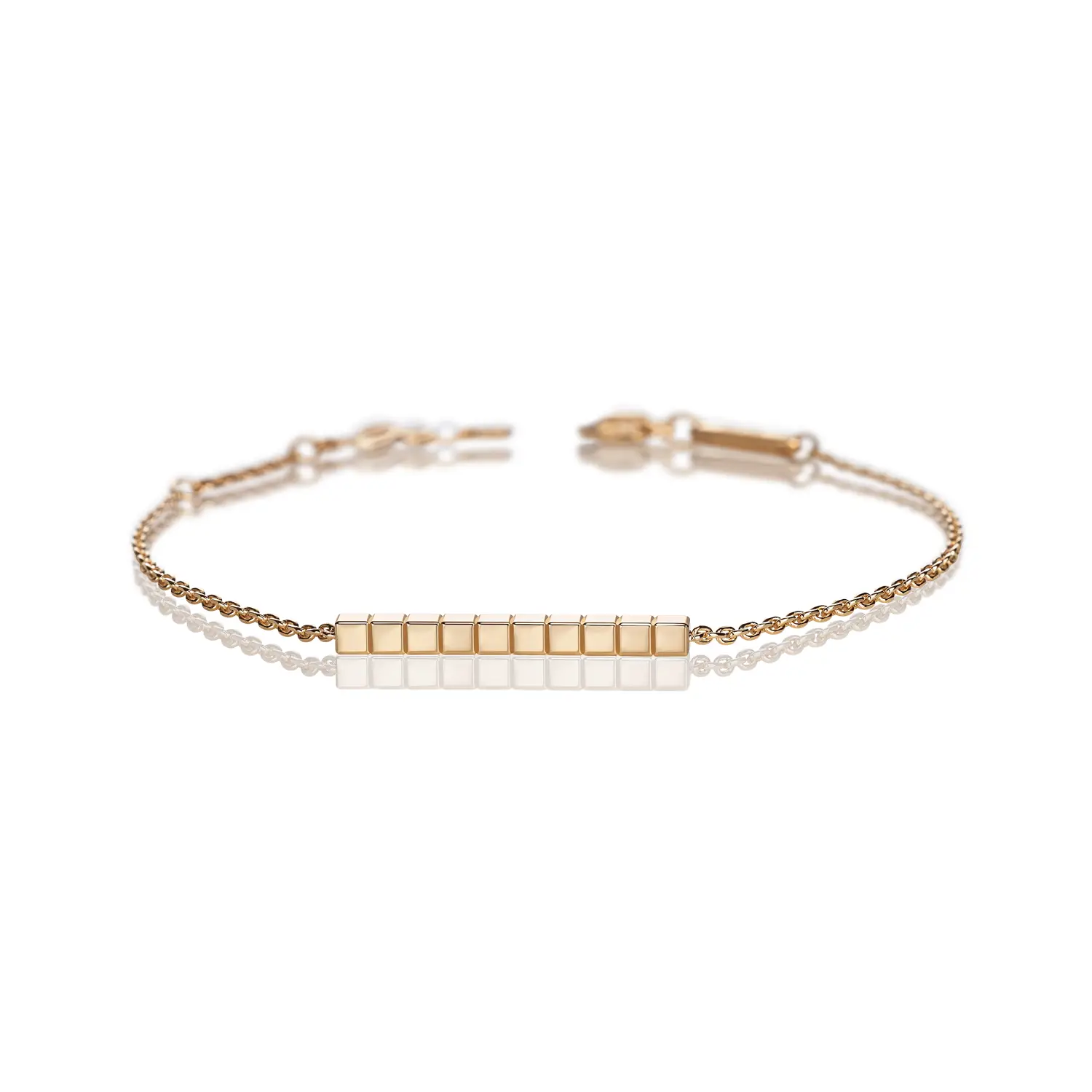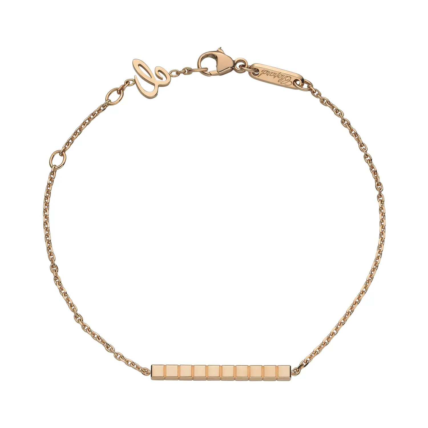 Этот современный браслет из коллекции Ice Cube воплощает архитектурную эстетику, минимализм и утончённую роскошь, характерные для бренда Chopard. Изготовлен из 18-каратного розового золота с этическим происхождением, украшен геометрическими формами в виде ледяных кубиков, отражающих свет при каждом движении.