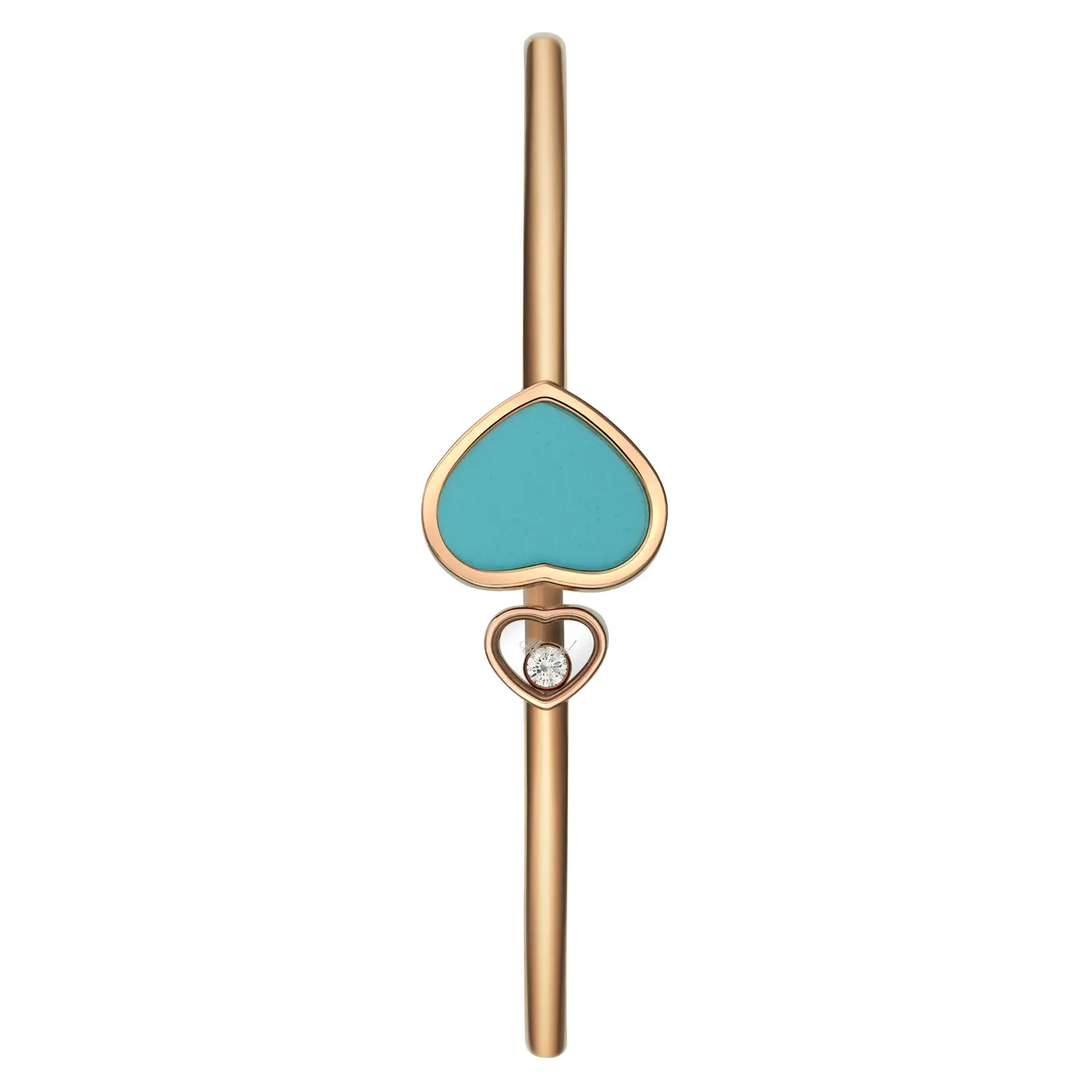 Этот сияющий браслет из коллекции Happy Hearts объединяет игривость, женственность и символ радости. Изготовлен из 18-каратного розового золота, украшен сердцем с бирюзовым камнем и свободно движущимся бриллиантом весом около 0,05 карата, который сверкает при каждом движении. Бирюза добавляет украшению живости и позитивной энергии, а изящные линии отражают вечную элегантность Chopard.