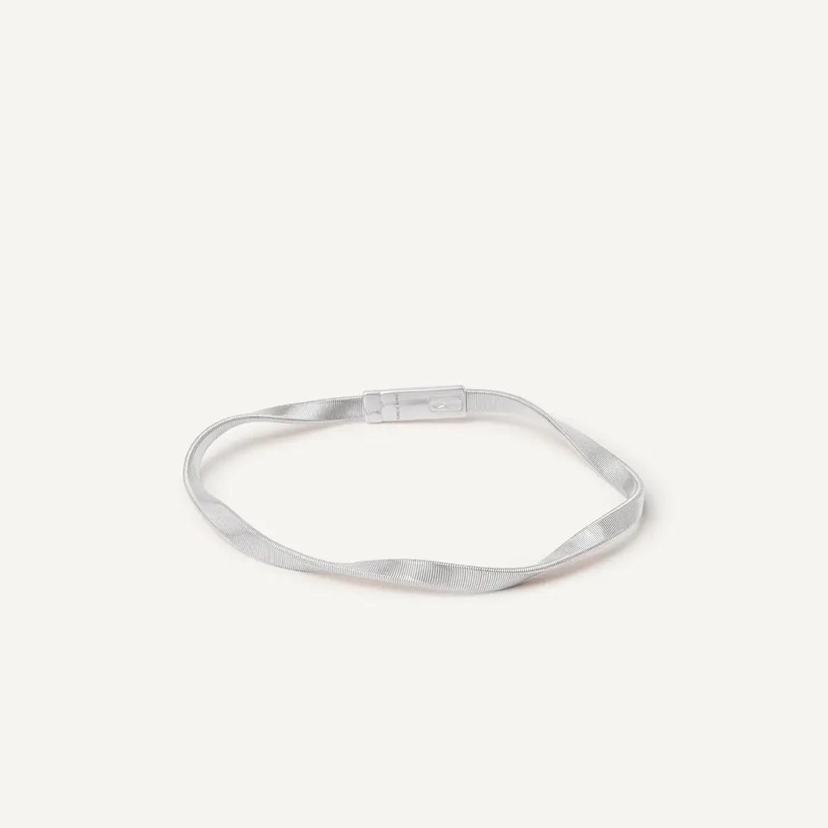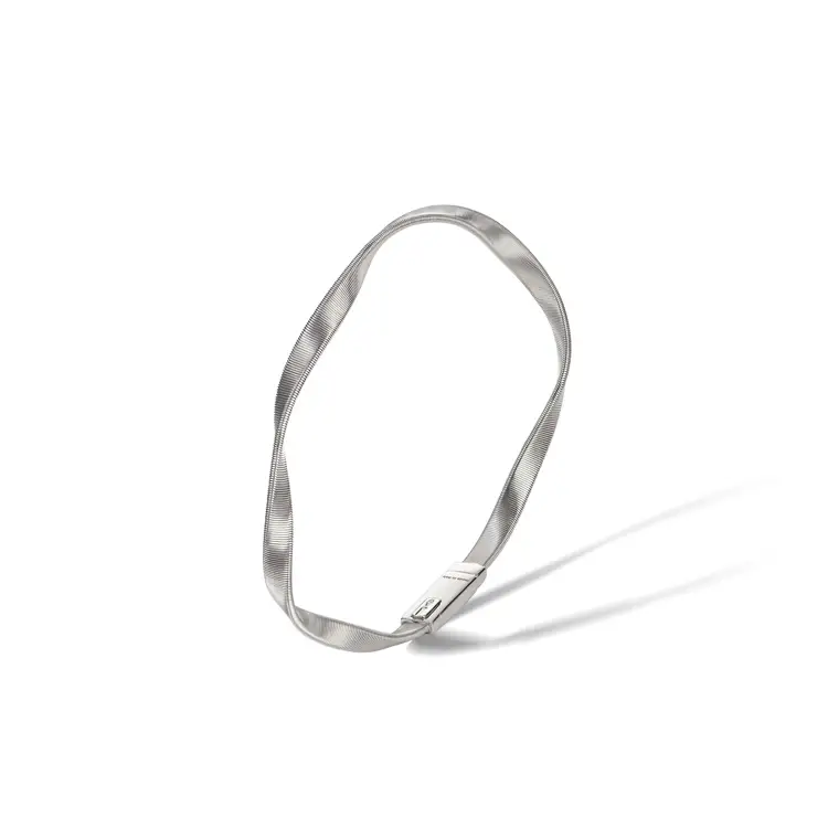 Браслет Marco Bicego Marrakech BG750 W 01 сочетает изысканную простоту и высочайшее мастерство исполнения. Выполнен из белого золота 18 к (750/1000) с блестящей полировкой, он излучает чистоту и элегантность. Длина 18,5 см обеспечивает комфортное прилегание к запястью и утончённый вид.