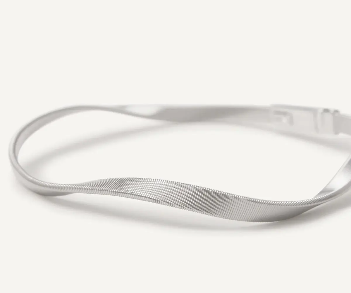Коллекция Marrakech известна своей уникальной техникой – тончайшие золотые нити скручиваются вручную, образуя плавные, текучие линии. В данной модели сияние белого золота создаёт эффект мягкого света и благородного мерцания. Каждый браслет создаётся вручную итальянскими мастерами, превращая металл в искусство.